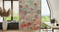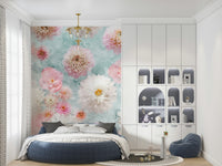 Dahlia Flowers, Full Frame. Transform your living space into a serene garden with this captivating "Dahlia Flowers" design. A watercolour-inspired aesthetic infuses your walls with a soft and dreamy atmosphere, creating an ambience of tranquility. The delicate arrangement of dahlia blooms, rendered in shades of blush pink, crisp white, and subtle apricot tones, brings a touch of natural elegance to any room.