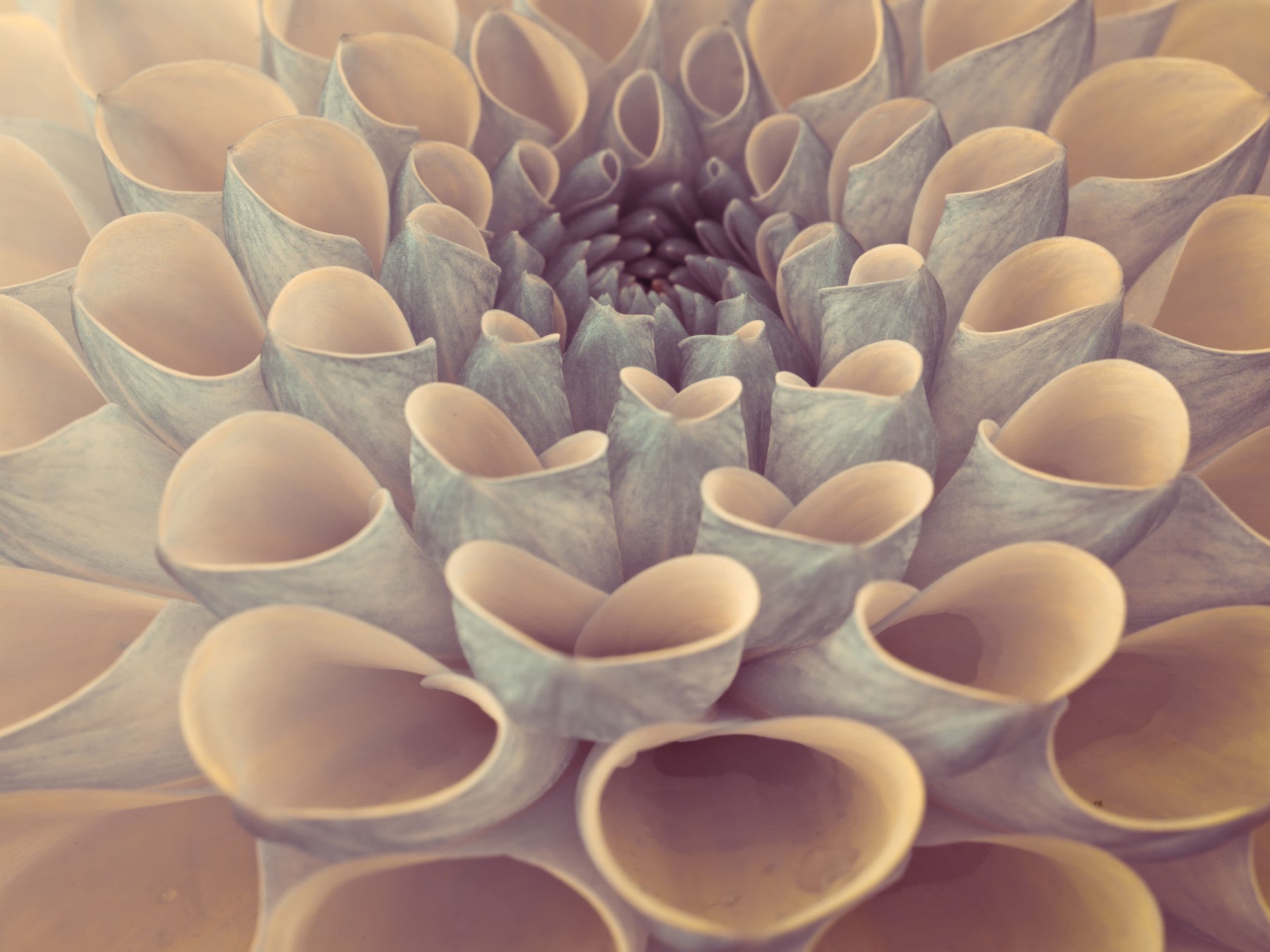 Immerse yourself in the intricate beauty of 'Dahlia Petals,' a wallpaper that captures the mesmerising detail and delicate textures of a dahlia flower in full bloom. This macro view showcases the repeating patterns and subtle gradients within each petal, creating a sense of depth and rhythm. The muted colour palette, with its gentle blend of pale peach and soft blue-grey, evokes a serene and calming atmosphere. The unique lighting emphasises the sculptural quality of the petals, transforming them into almost abstract forms. 'Dahlia Petals' is perfect for adding a touch of sophisticated elegance and natural artistry to any digital space, bringing a sense of tranquility and visual interest to your screen. Experience the quiet beauty of nature's design.