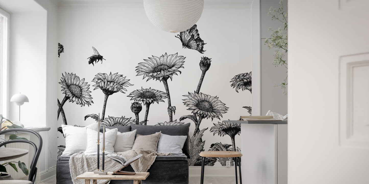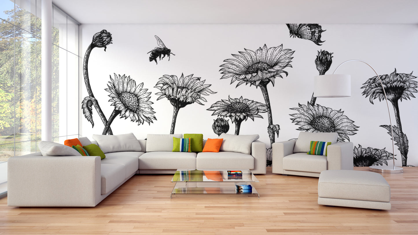 Adorn your bathroom with the timeless elegance of the black and white daisy flower hand drawn mural wallpaper. This artful design features a collection of daisies sketched with intricate detail, inviting a touch of nature's delicate artistry into your home. The black and white palette infuses the space with classic sophistication, making this flower wallpaper an ideal choice for those seeking a blend of traditional charm and modern style. Each stroke of this hand-drawn mural captures the whimsical dance of daisies and fluttering butterflies, adding a visual interest that is both calming and captivating. Perfect for creating a striking focal point, this wallpaper will complement a variety of decor styles, turning a simple bathroom into a gallery of botanical illustrations.