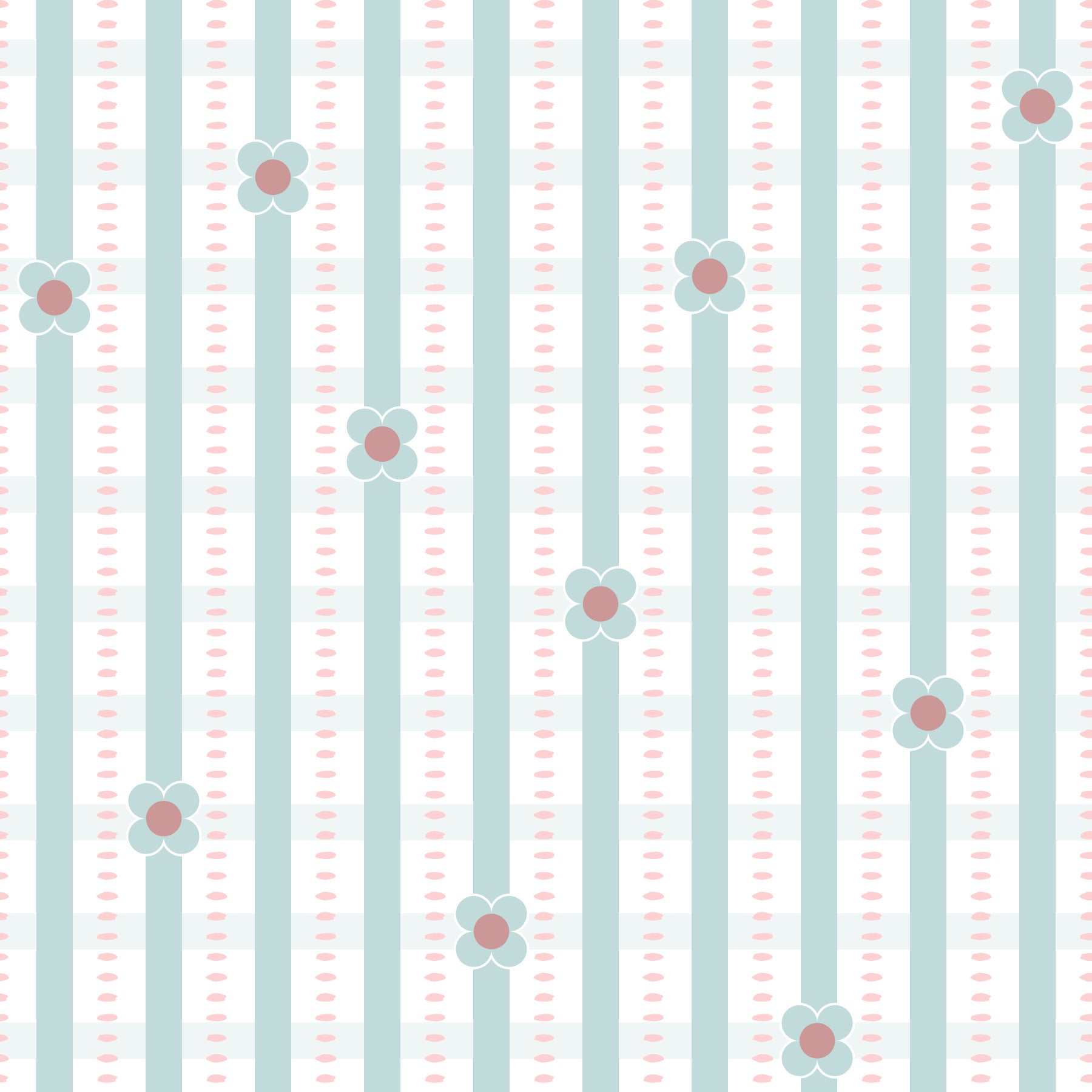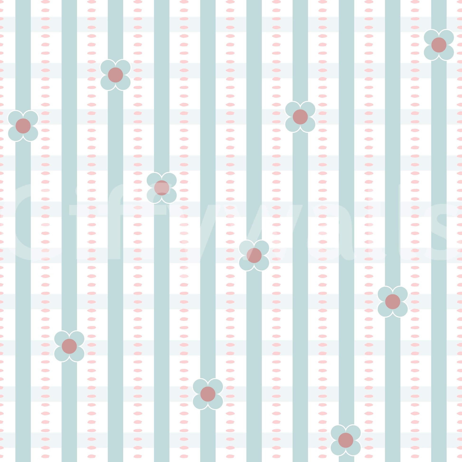 Bring a soft, cheerful vibe to your space with this daisy and stripe wallpaper. Pastel blue vertical stripes pair with rows of pink dashes and sweet floral accents. The design presents a fun, orderly structure. Ideal wallpaper for walls in a nursery, girls room, or bathroom. It works well with light furniture and adds a touch of vintage charm to interiors.