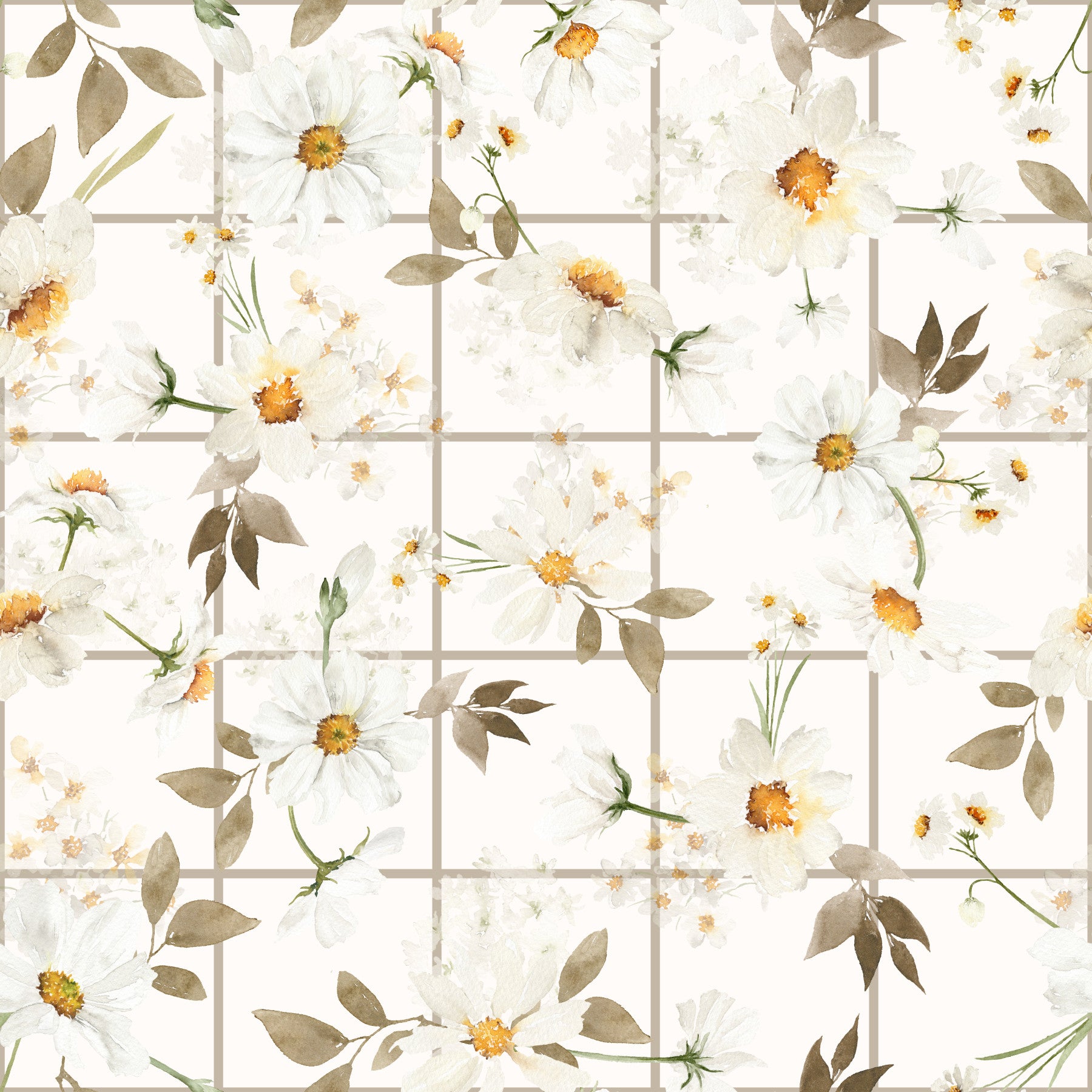 Bring nature indoors with this graceful floral wallpaper for walls by Uta Naumann. The design features white daisies and foliage against a grid-like background, creating a serene, window-pane effect. Soft beige and white tones create a calming atmosphere, perfect for bedrooms, living rooms, or hallways. The watercolour style offers a hand-painted, artistic touch. Let this floral pattern bring a subtle, organic charm to your home. This design complements interiors with a touch of natural grace.