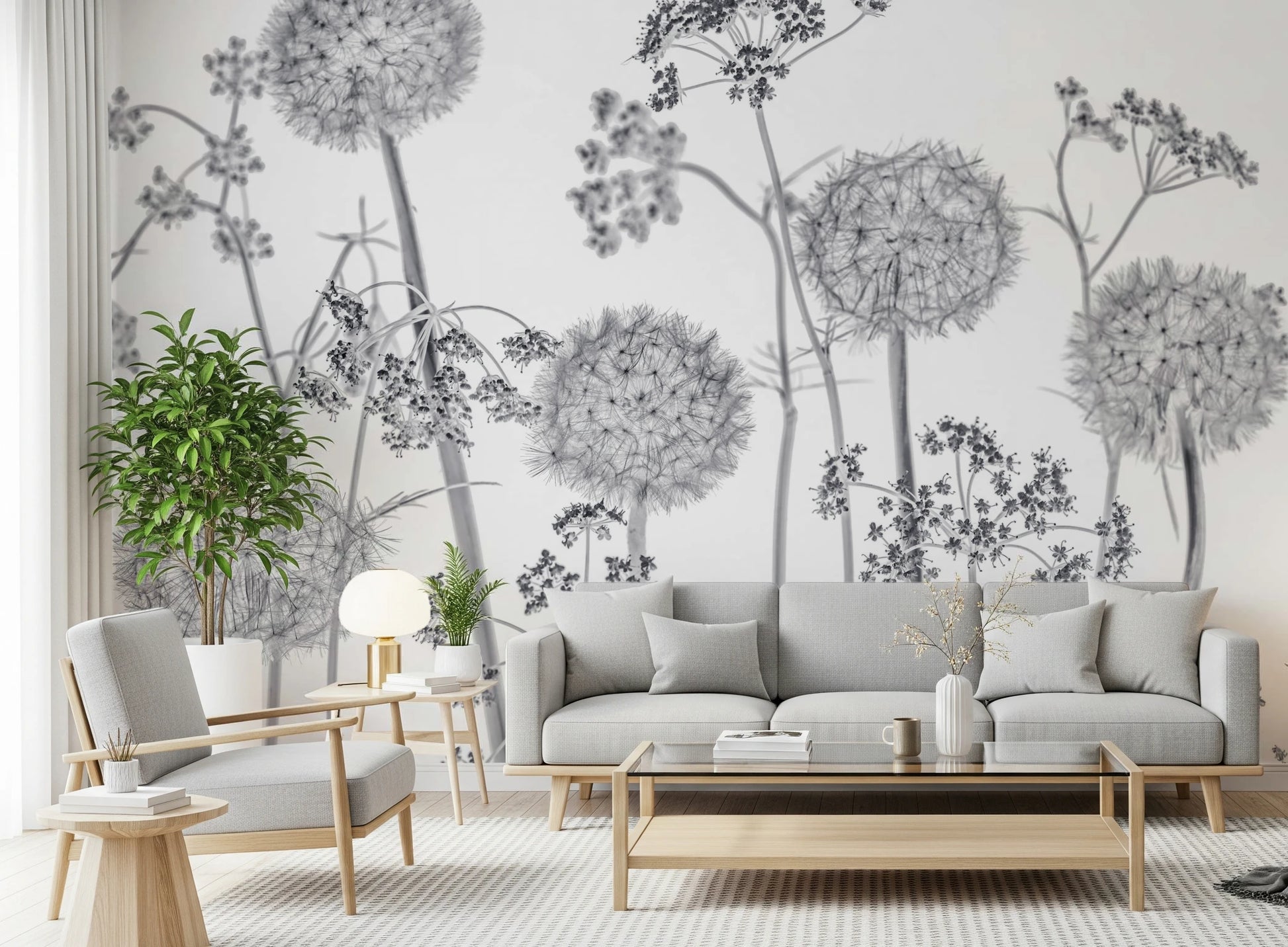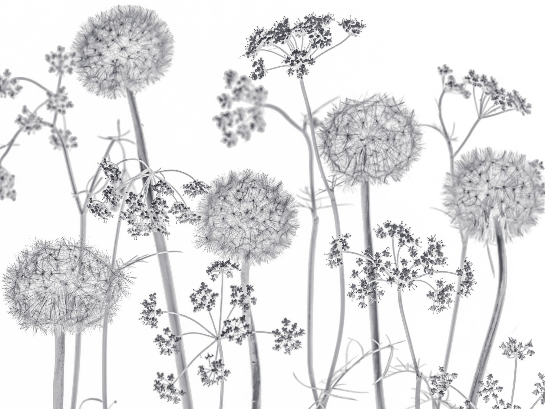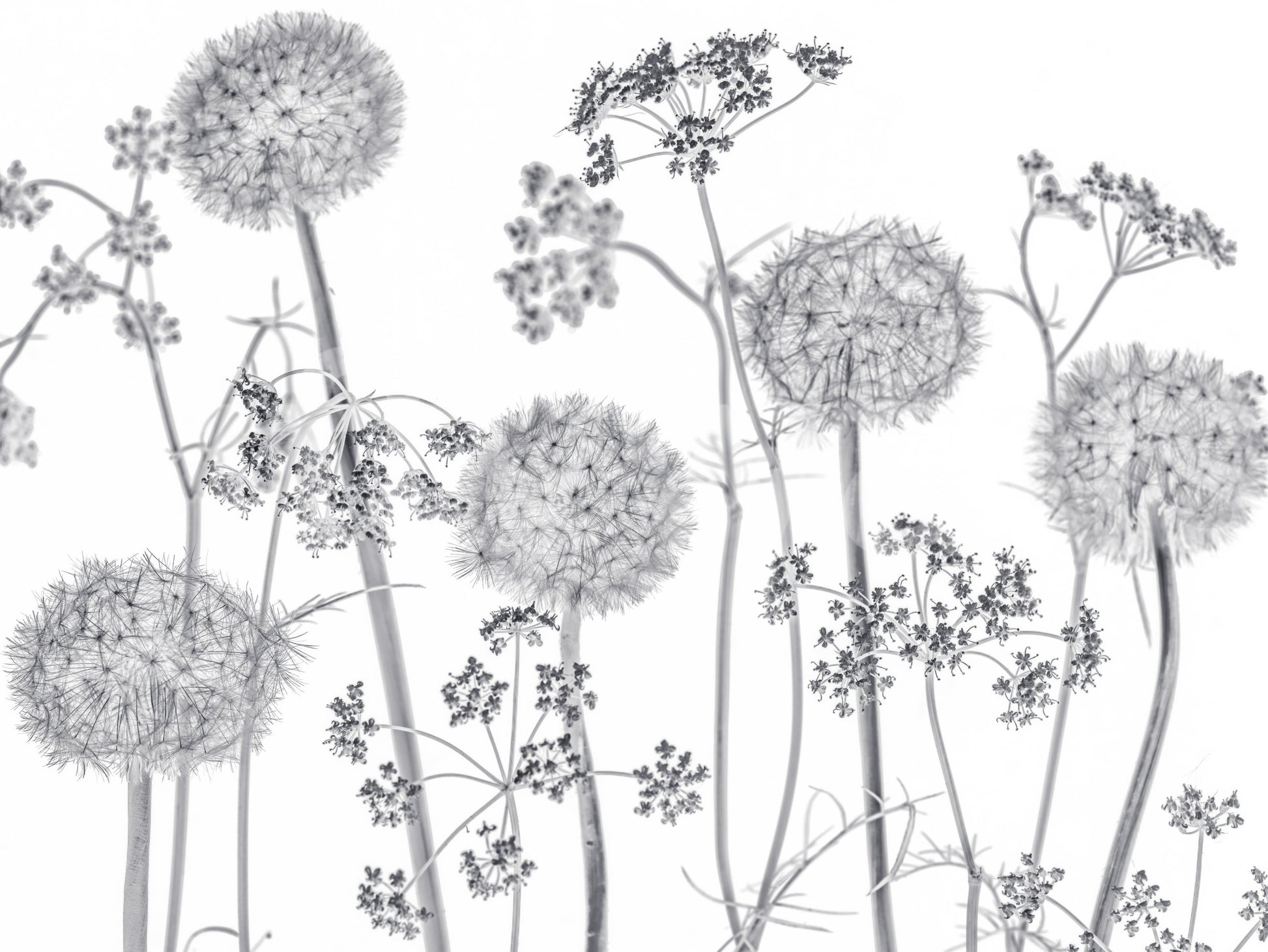 Meadow flowers on white background. Invite the serene beauty of nature into your home with "Dancing Wildflowers", a captivating monochrome wall décor piece. This artwork portrays a whimsical meadow of wildflowers, their delicate forms captured in stunning detail. Imagine the gentle sway of dandelion clocks and intricate umbel blossoms as they dance in an unseen breeze, their textures rendered with a clarity that brings the outdoors in. The monochromatic palette adds a touch of elegance and timelessness, allowing the intricate shapes and forms of the flora to take centre stage. This piece offers a contemporary yet soothing ambience, perfect for creating a tranquil and inviting space. Transform any room into a peaceful sanctuary where the spirit of the wildflower meadow inspires calm and serenity.