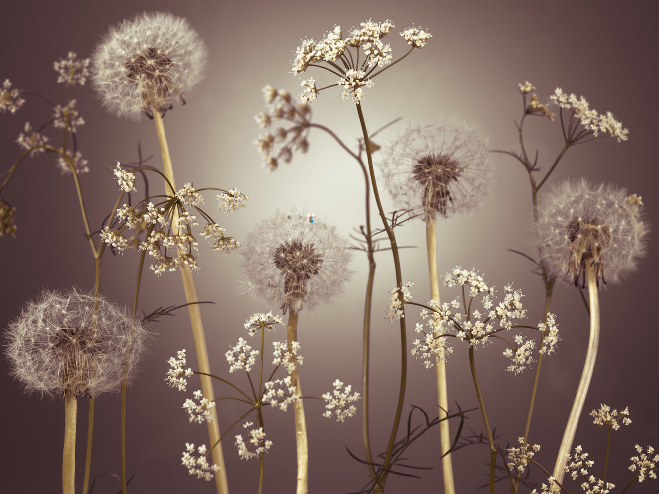 Soft and dreamy mural featuring dandelion seeds in the breeze