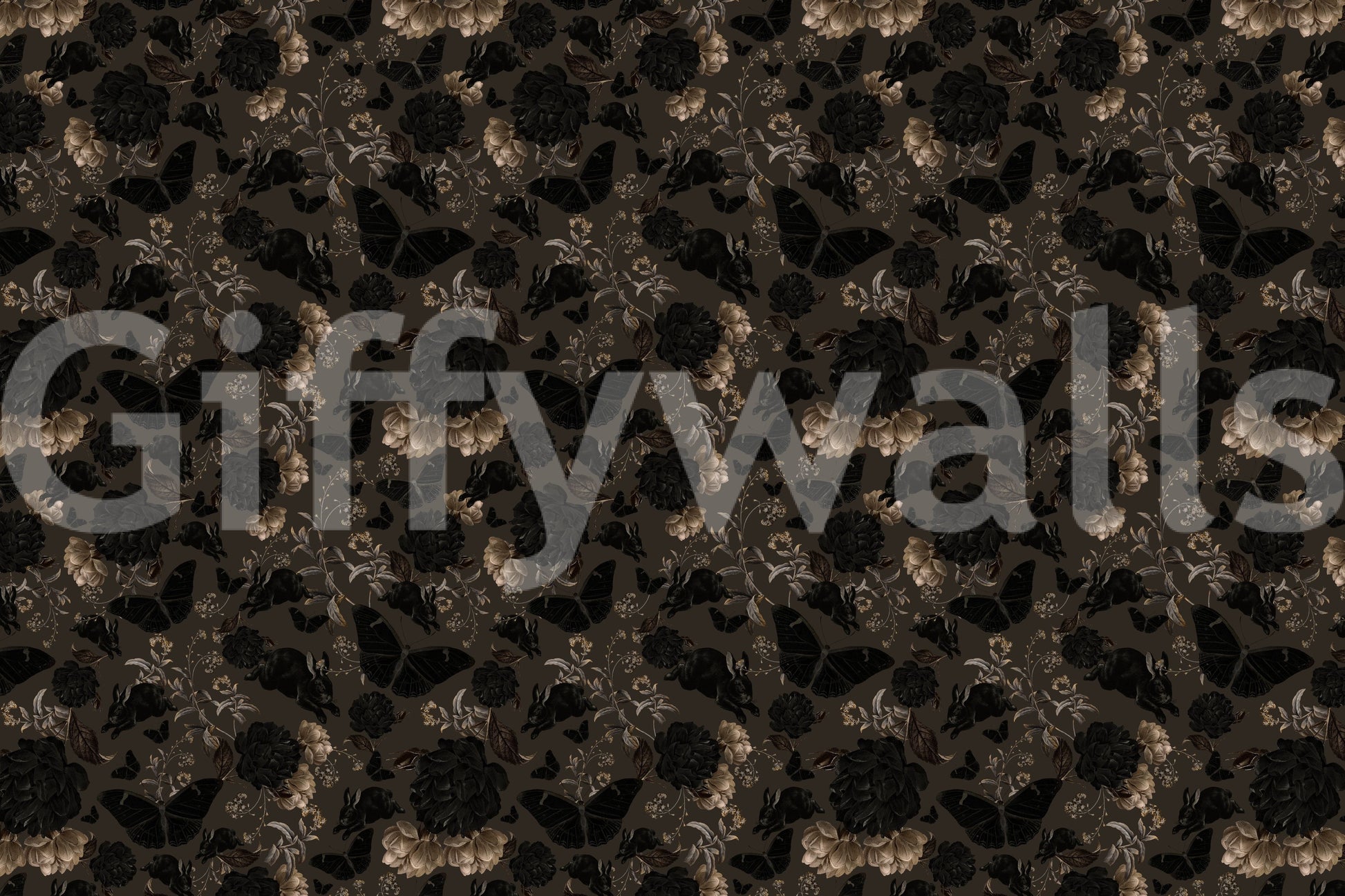 Bring a touch of mystery indoors with this moody floral and fauna pattern by Uta Naumannn. It features a dark backdrop enhanced with elegant black flowers, rabbits, and butterflies. This wallpaper for walls is perfect for creating a dramatic accent in a bedroom or adding sophistication to a living room. The design's rich colour palette also suits a hallway or dining room, offering a luxurious ambiance.