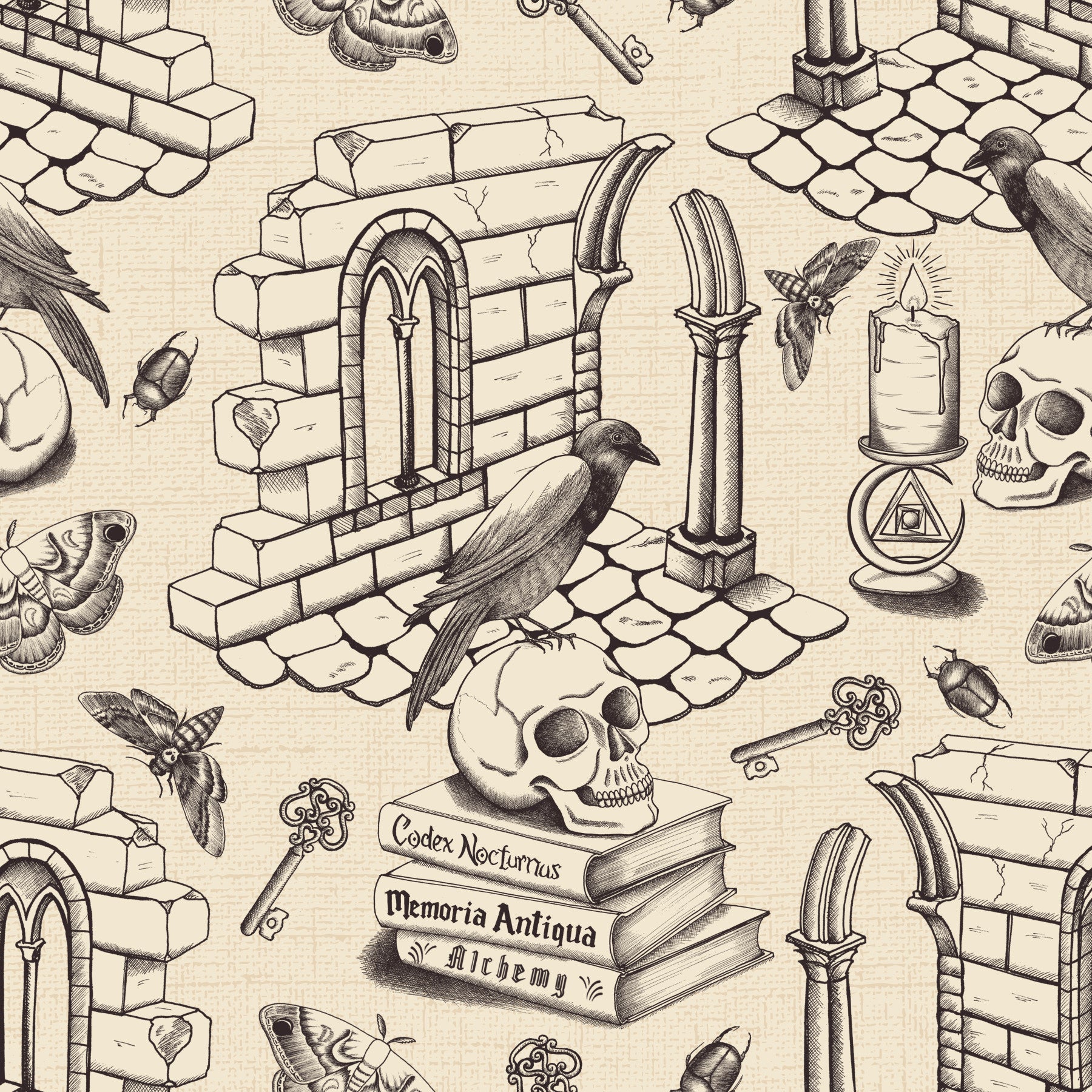 Immerse yourself in the enigmatic beauty of "Dark Academia Toile de Jouie - Ink Black." This wallpaper captures the essence of gothic romance with intricate ink drawings of crumbling stone arches, ancient keys, and a raven perched atop a skull resting on books titled 'Codex Nocturnus,' 'Memoria Antiqua,' and 'Alchemy.' Moths, beetles, and a lit candle add to the captivatingly mysterious atmosphere. The beige background provides a perfect contrast, enhancing the detailed, hand-drawn aesthetic reminiscent of antique illustrations. Perfect for those who appreciate dark academia's blend of intellectual curiosity and haunting charm.