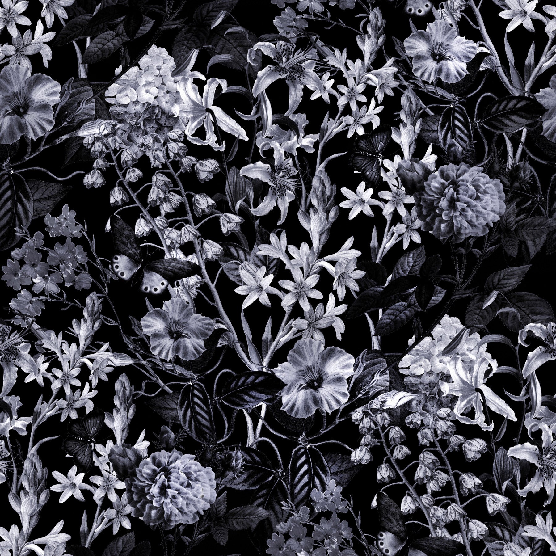 This wallpaper features a striking monochromatic floral design against a dark backdrop. Elegant flowers and delicate butterfly details create a sophisticated, nature-inspired ambiance. The seamless pattern makes it an ideal wallpaper for walls in bedrooms, living rooms, or hallways, adding a dramatic yet graceful touch. It creates a visually stunning effect that enhances the sophistication of modern or classic interiors.