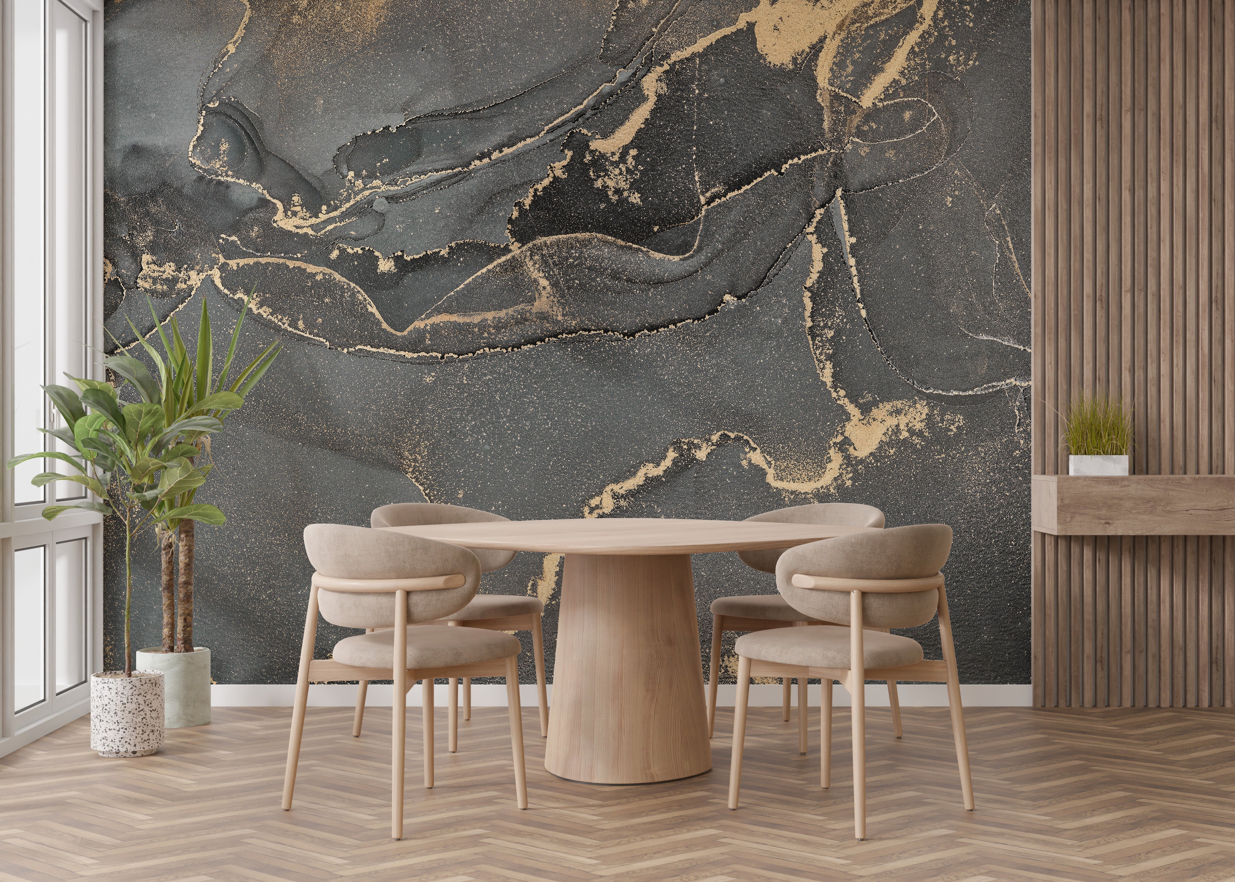Dark grey wallpaper mural with alcohol ink-inspired swirls.