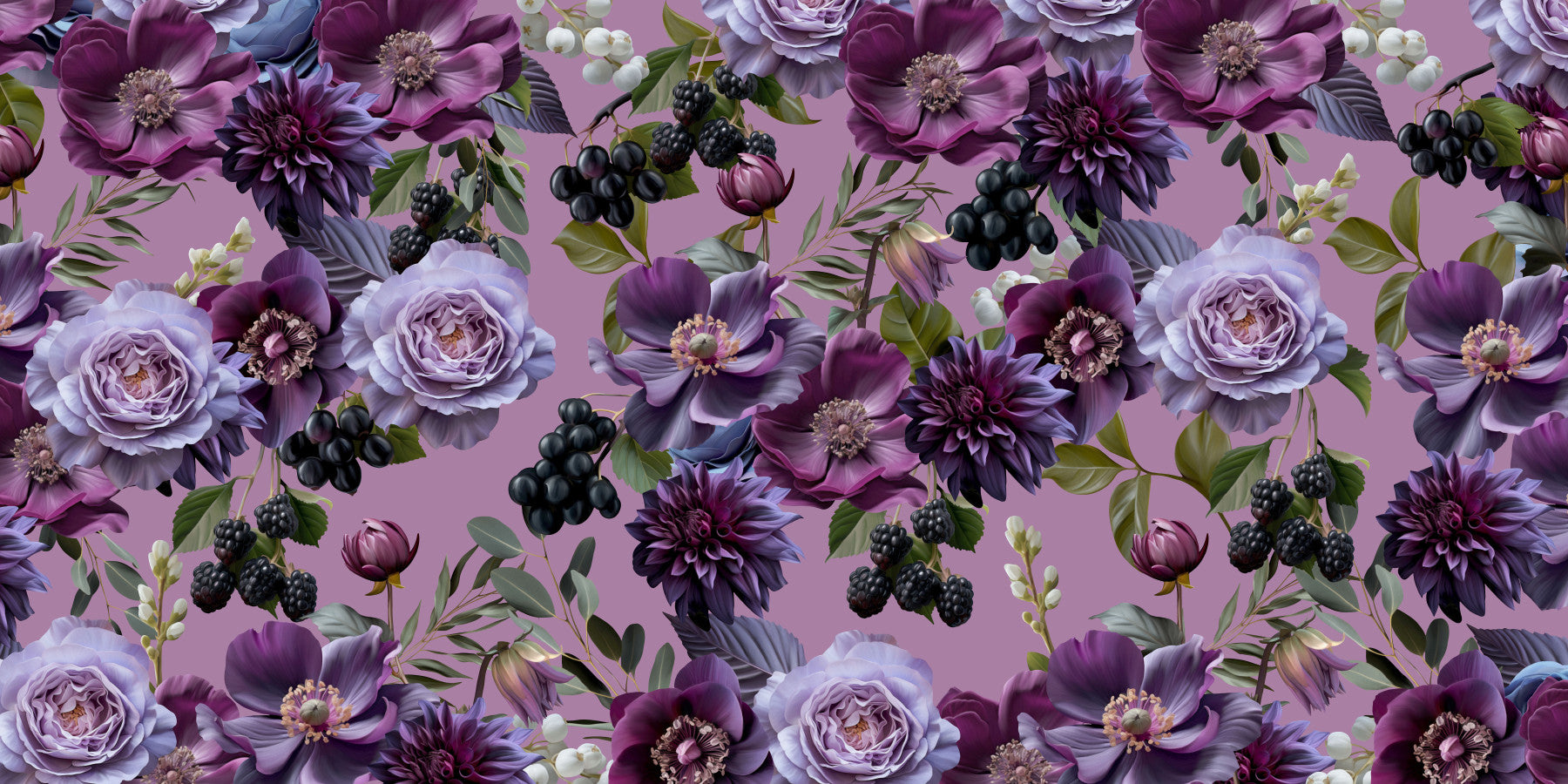 Make a statement with this lavish floral design. This captivating wallpaper presents a rich blend of roses, dahlias, and foliage. All rendered in shades of purple against a subtle lavender backdrop. Use this wallpaper for walls in your bedroom, living room or dining room. It instantly upgrades interiors with timeless, luxury and style. The pattern features detailed textures and an opulent design. The effect is dramatic and impactful.
