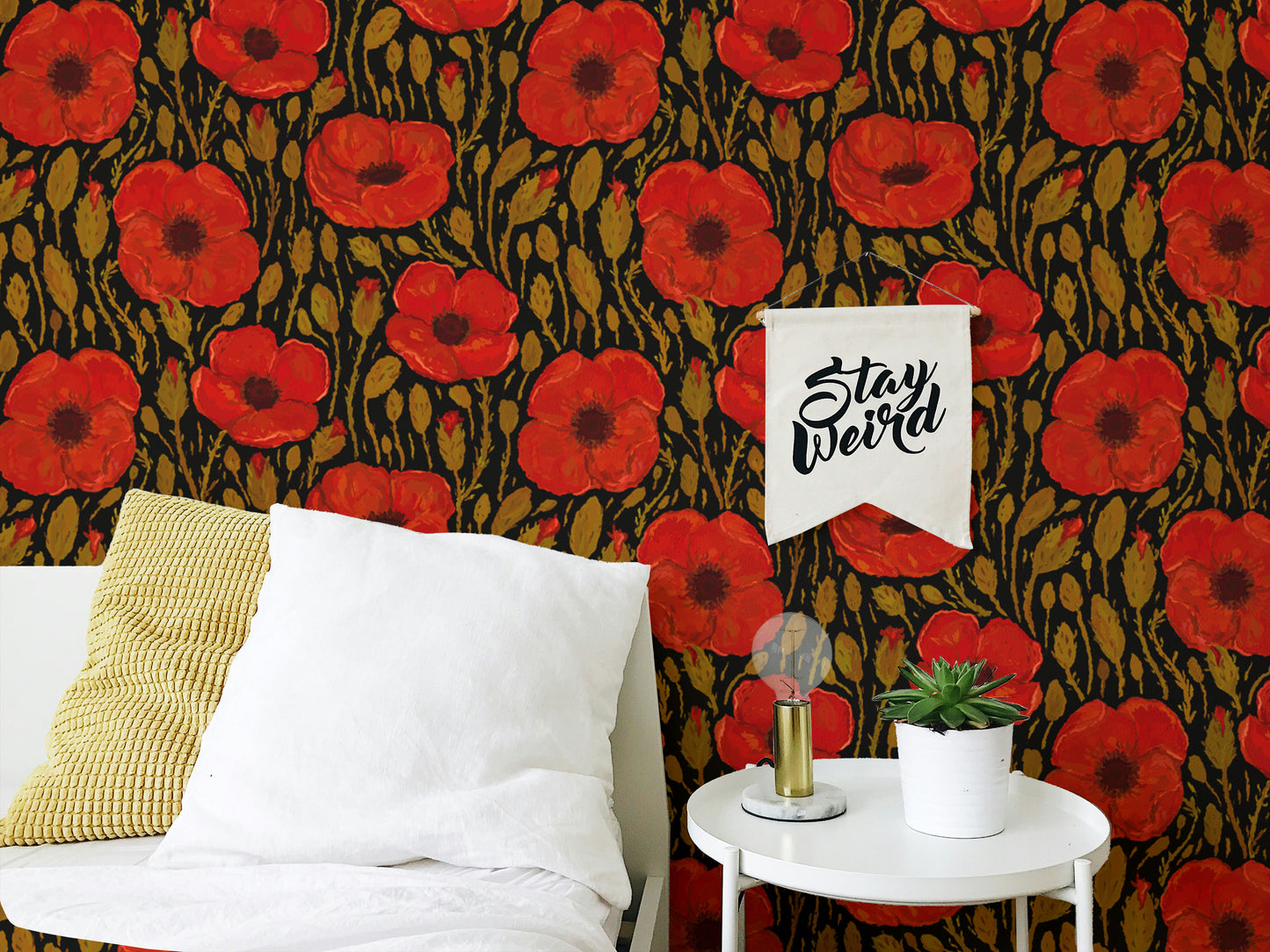 Artistic dark red poppy wallpaper for a unique and bold wall statement.
