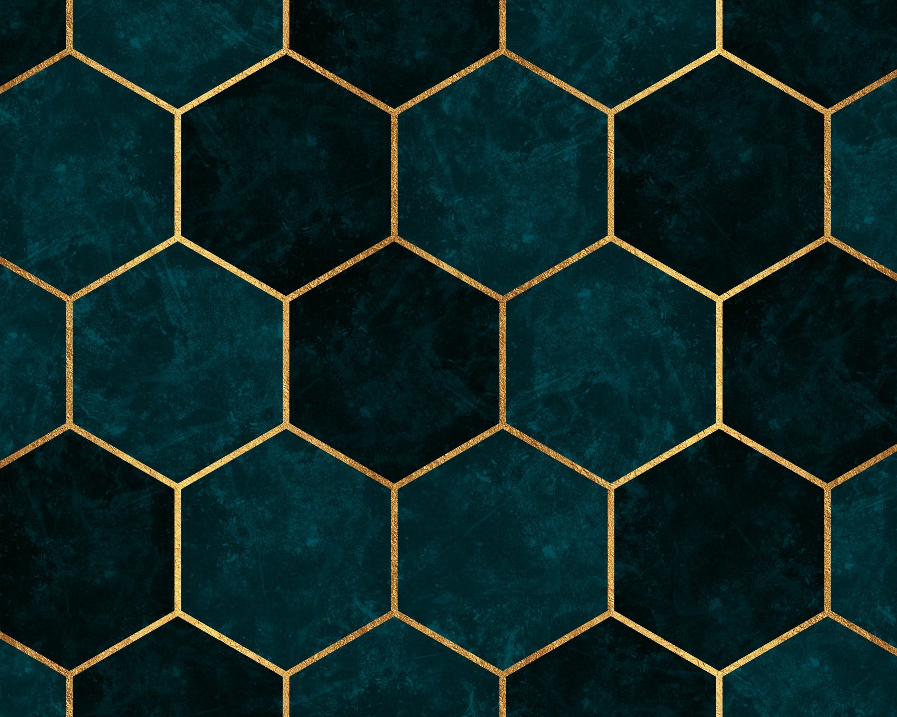 Dark teal hexagon wall mural with gold outlines