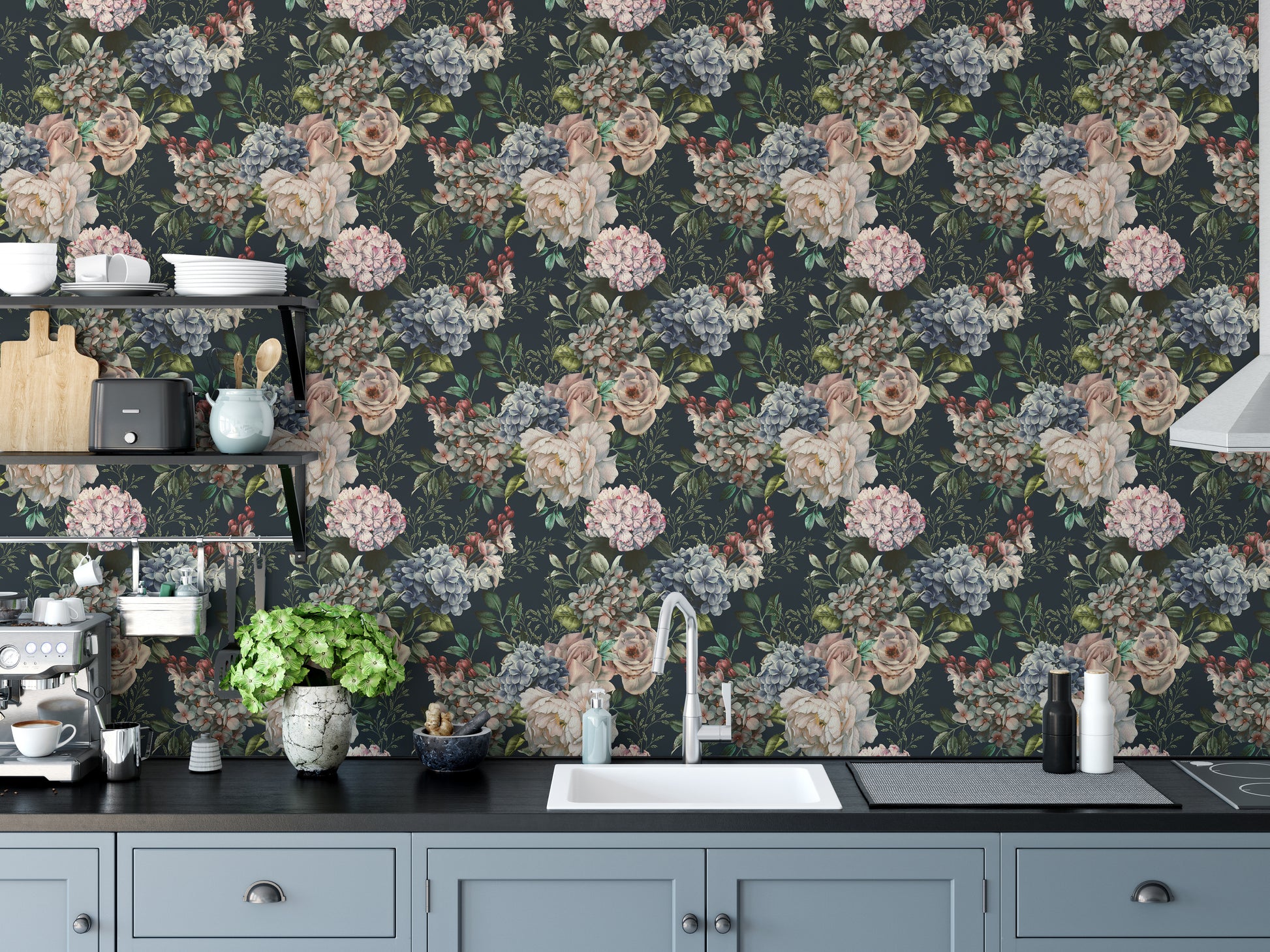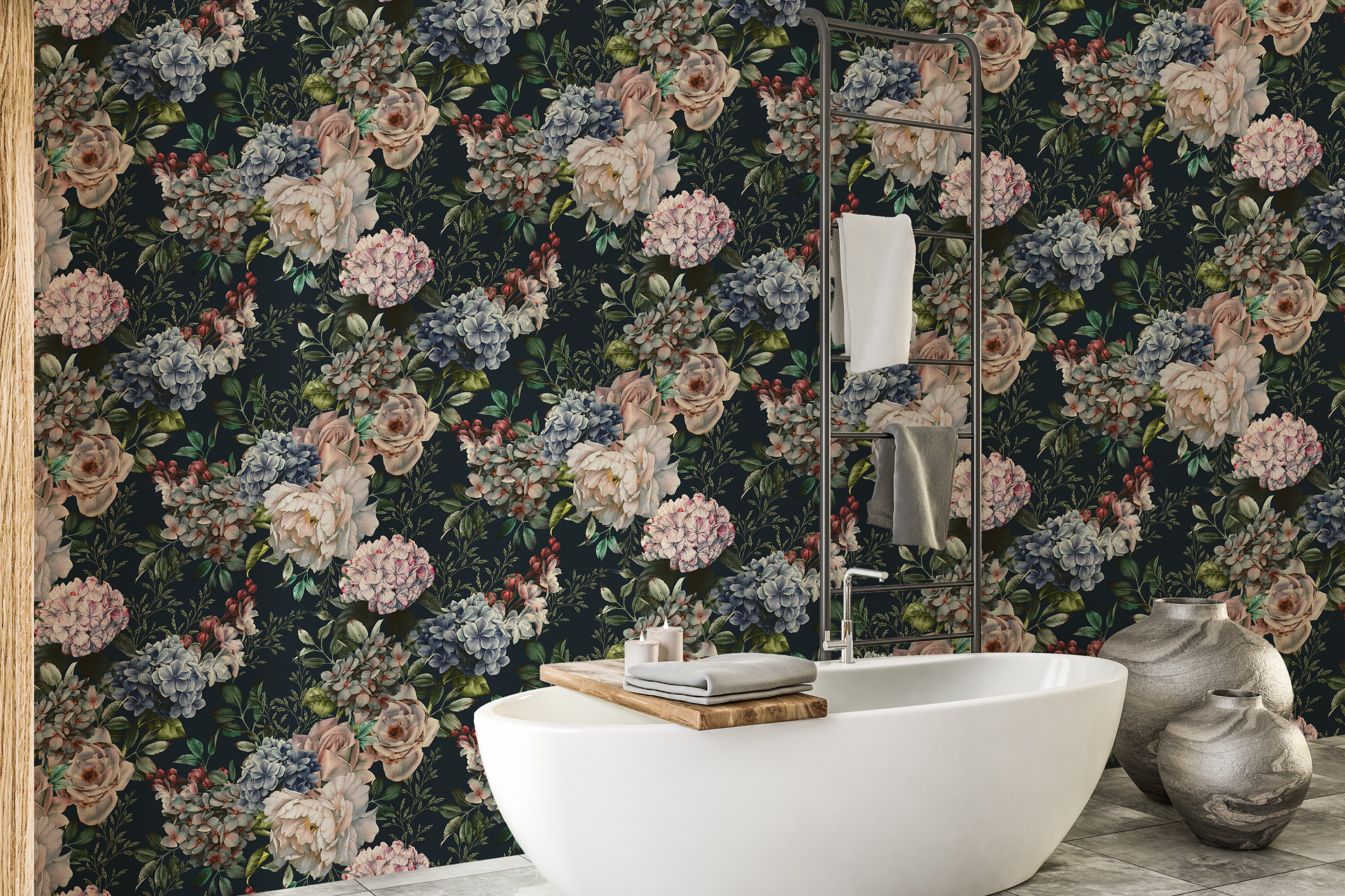 Elevate your living space with our luxurious dark watercolor seamless floral mural wallpaper. Meticulously crafted with rich, moody hues, this wallpaper exudes elegance and sophistication. The intricate floral patterns, painted with a watercolor effect, seamlessly blend into one another, creating a mural-like masterpiece for your walls.