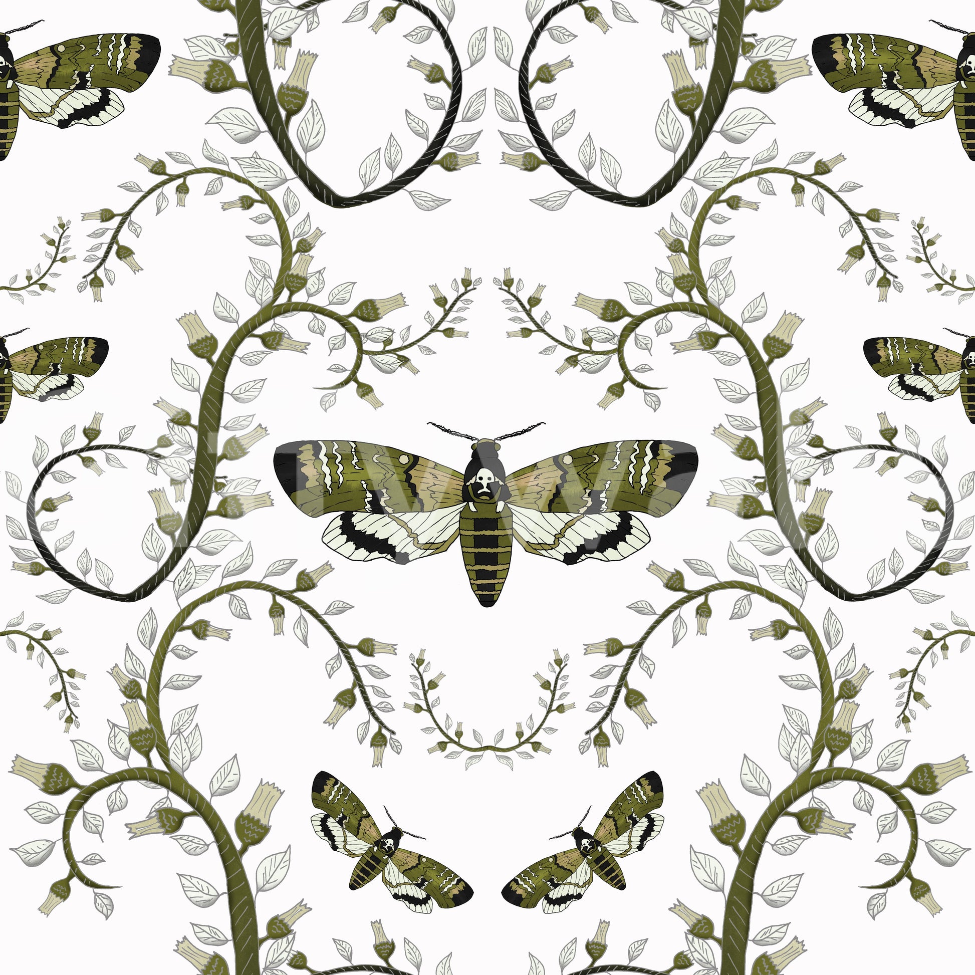 This wallpaper features a captivating design of Death's-Head Hawkmoths elegantly intertwined with stylised botanical elements. The moths, rendered in a rich olive green and black, contrast beautifully against the soft, silvery-grey leaves and beige flower buds. The intricate, swirling vines create a sense of movement and elegance, while the moths themselves add a touch of mystery and intrigue. The overall effect is a sophisticated and slightly gothic aesthetic, perfect for adding a unique touch to any room.