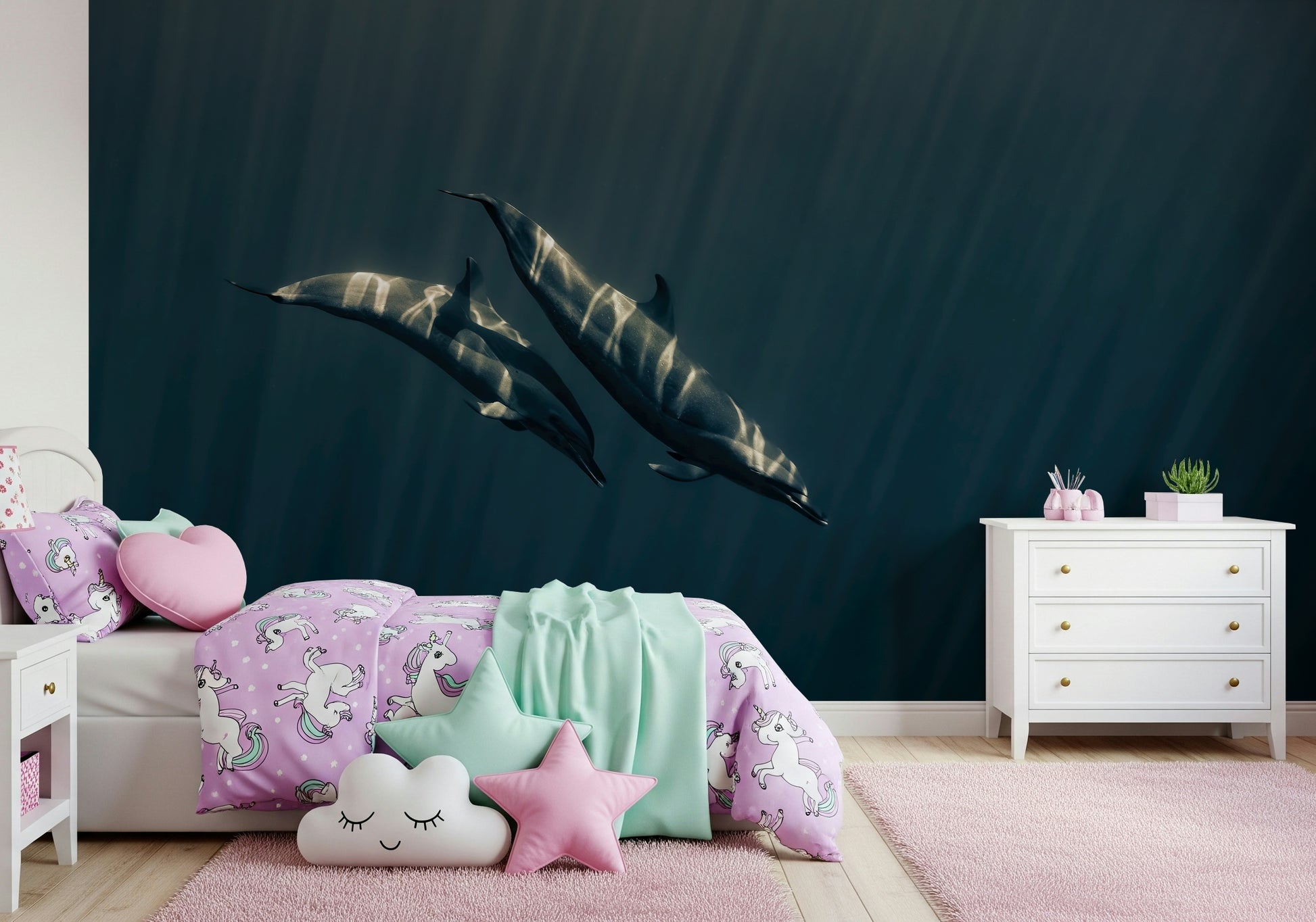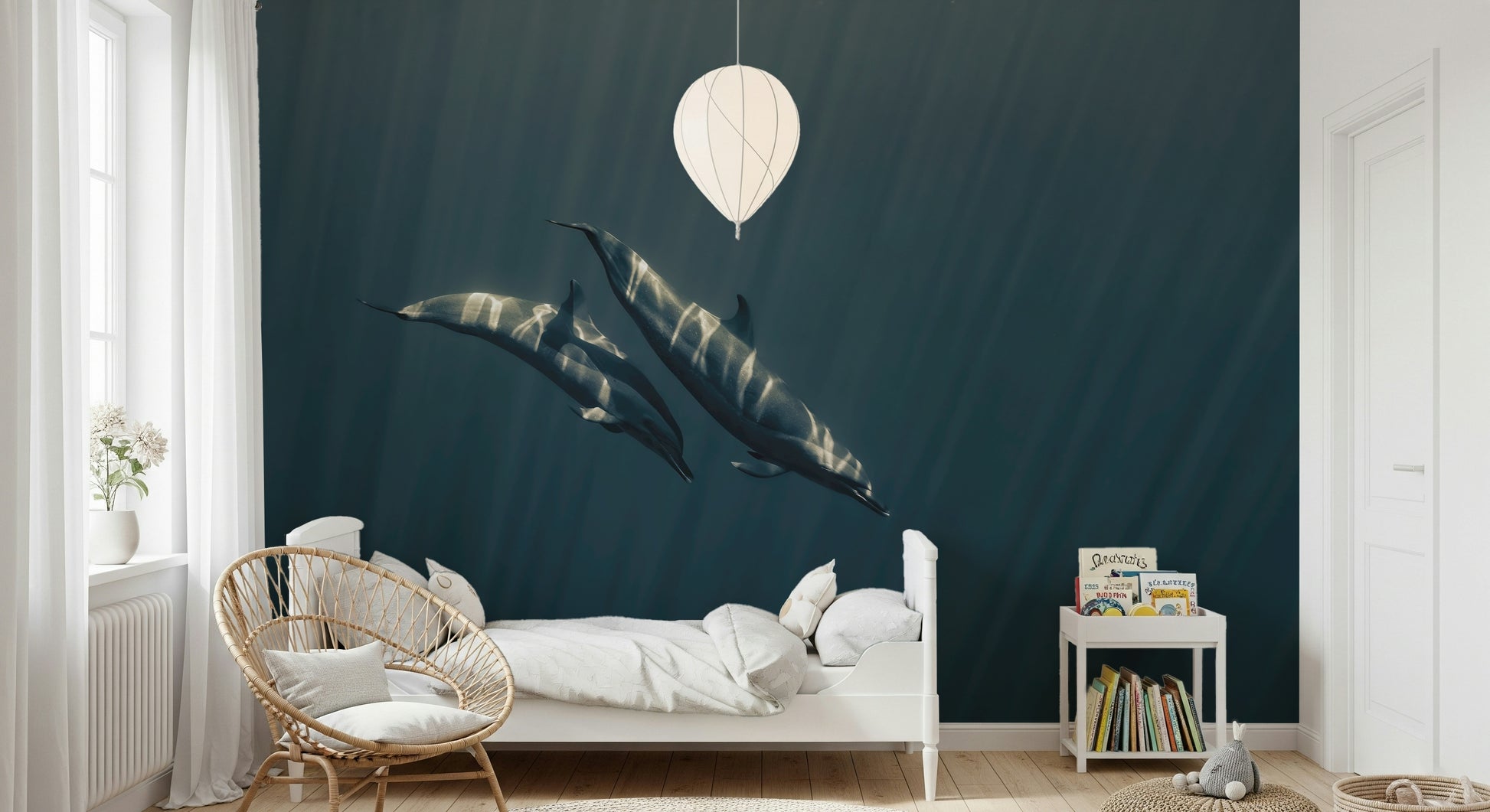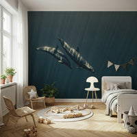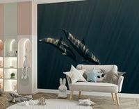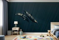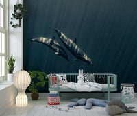 Dive into the deep sea with this evocative wallpaper. See dolphins gracefully gliding in an ocean of blue, with sunlight creating a striking visual effect. This design has a unique style that suits various rooms. Use this wallpaper for walls to give your living space a tranquil vibe. Its cool tones and artistic composition can complement modern or minimalist interiors. Consider it for a bedroom, study, or any space needing a touch of serenity.