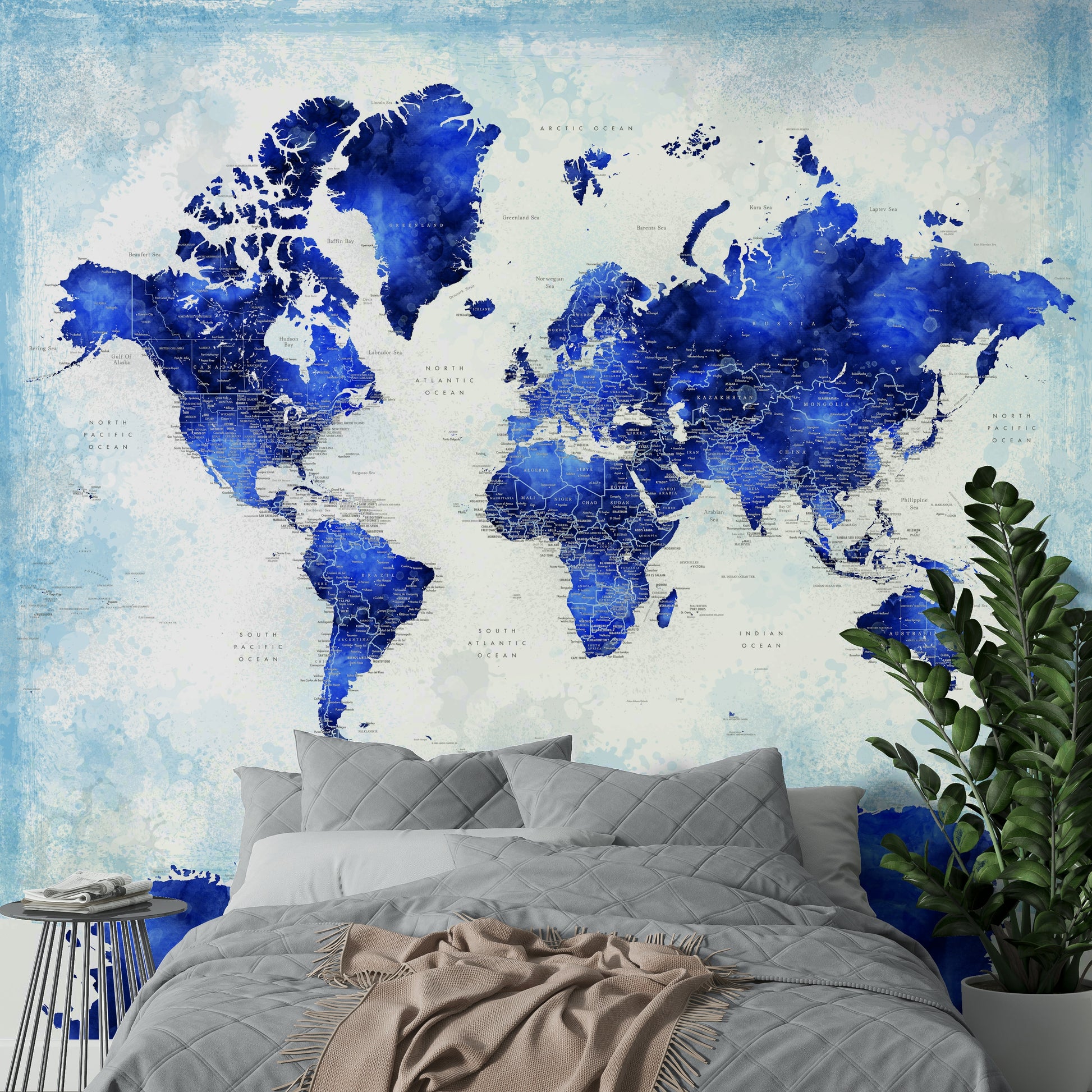 Make a bold statement with the Deep Blue Watercolour World Map Wallpaper, designed to inspire awe and wanderlust. Featuring rich, saturated shades of navy and royal blue with fluid watercolour textures, this mural adds depth and drama to any room. Every country and city is carefully labelled, making it as functional as it is striking. Ideal for modern offices, creative studios, living rooms, or travel-themed interiors, it brings sophistication and global flair to your walls. Available in peel-and-stick or traditional wallpaper options, it’s easy to install and eco-friendly. Elevate your space with this stunning map in timeless deep blue.