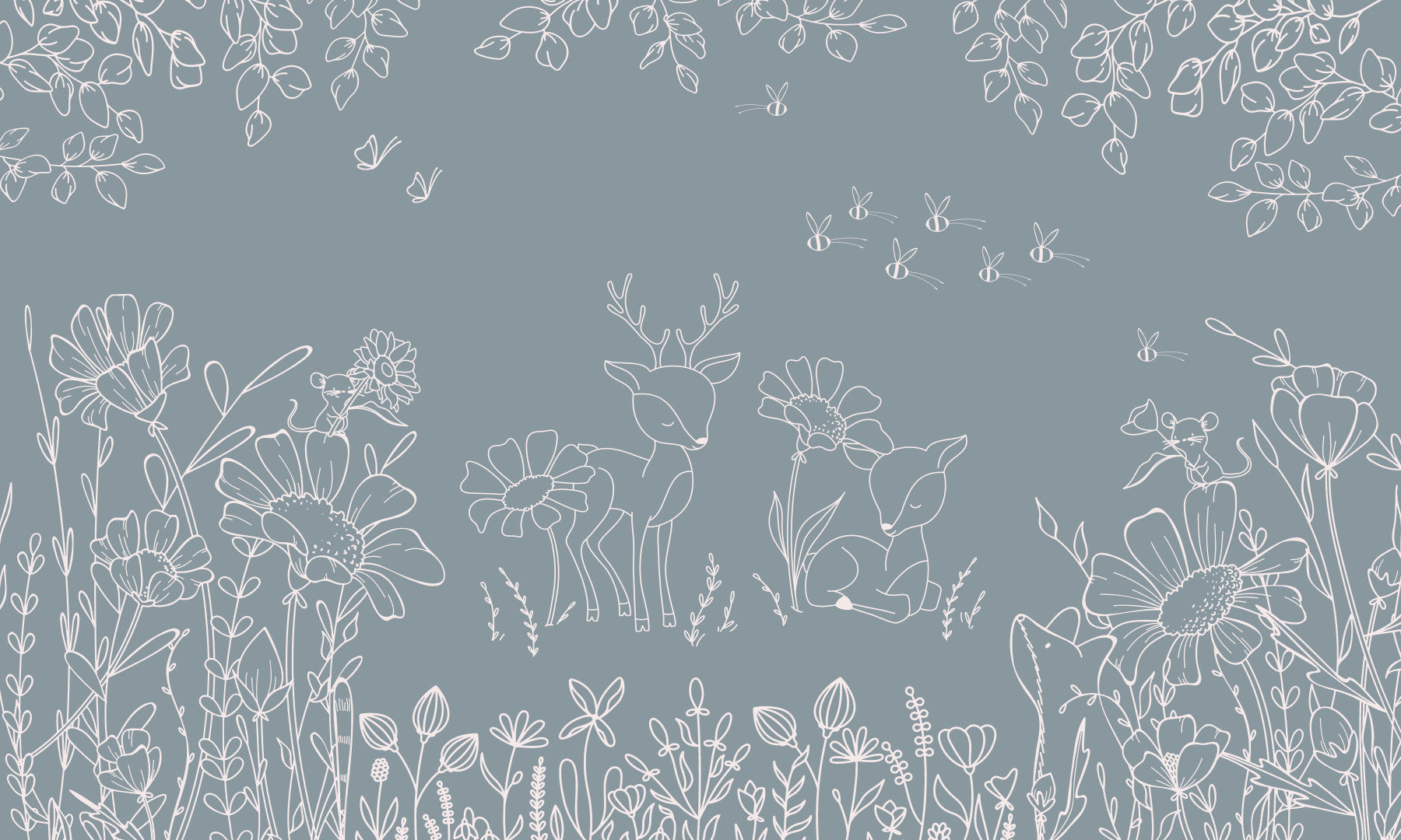 Nature-inspired wall mural in blue with hand-drawn deer and floral outlines