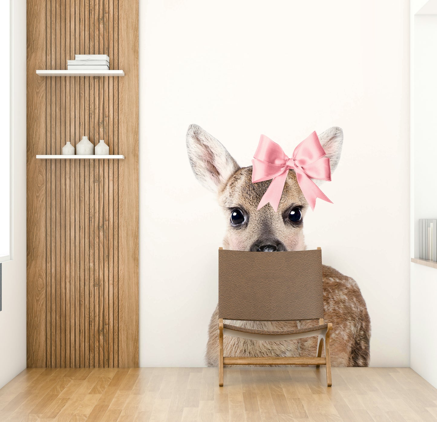 An adorable fawn takes center stage in this charming wallpaper. Its large, expressive eyes and delicate features are captivating, enhanced by a soft pink bow adorning its head. The image evokes feelings of innocence and gentleness, perfect for adding a touch of whimsical charm to any digital device. The fawn's soft, spotted coat contrasts beautifully against the clean white background, creating a striking visual impact. This heartwarming image is ideal for those who appreciate nature's beauty and the endearing qualities of wildlife. The simple yet elegant composition makes it a versatile choice for various styles and screen sizes.