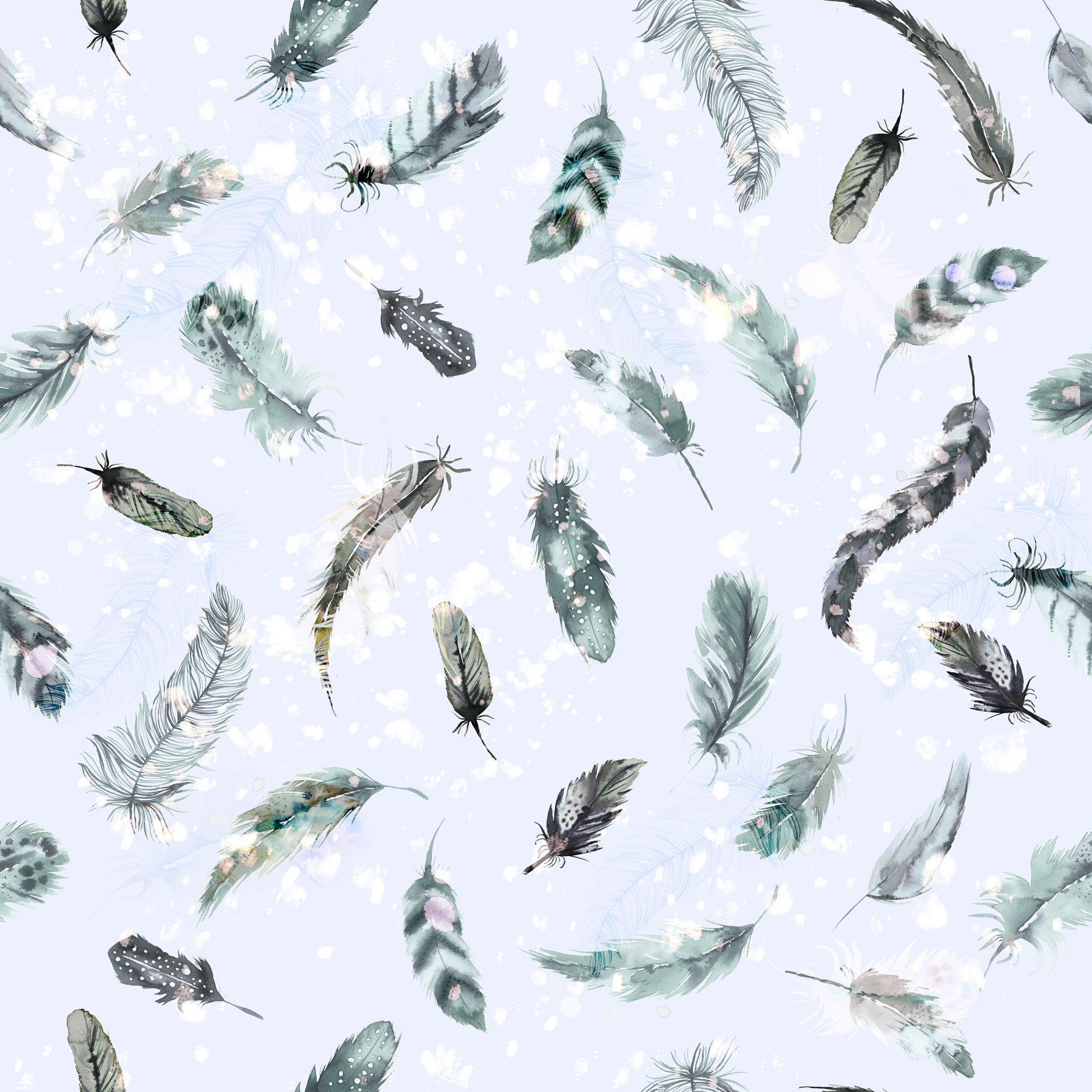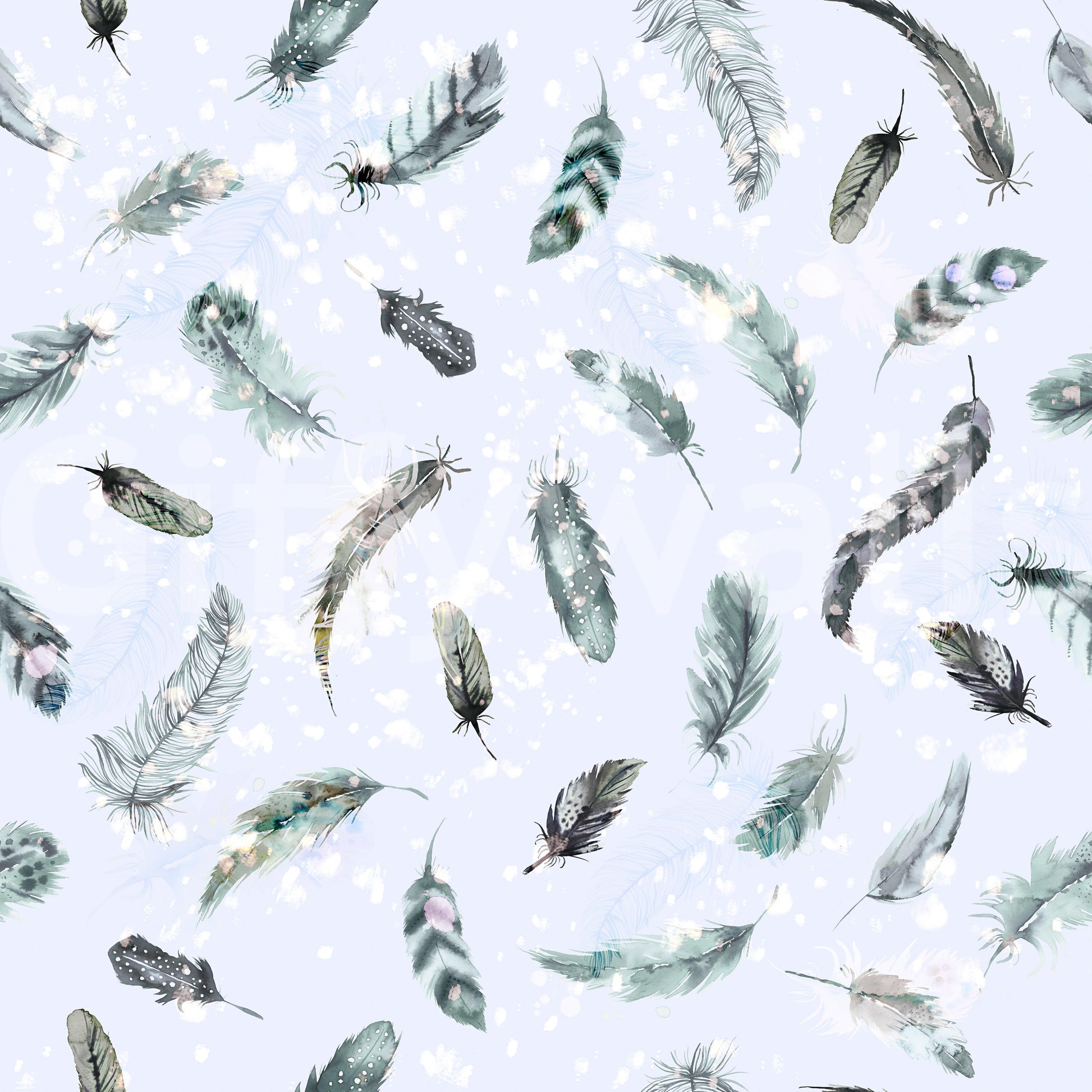 Embrace tranquility with this ethereal wallpaper. Soft blue hues form a serene backdrop for a delicate scattering of watercolor feathers. Each feather, rendered with exquisite detail, floats gracefully, creating a sense of effortless movement and airy lightness. Subtle splashes of white and hints of grey and black add depth and visual interest to this calming and sophisticated design, perfect for a peaceful and elegant atmosphere. The overall effect is one of quiet beauty and understated elegance, ideal for those seeking a calming and inspiring digital backdrop.