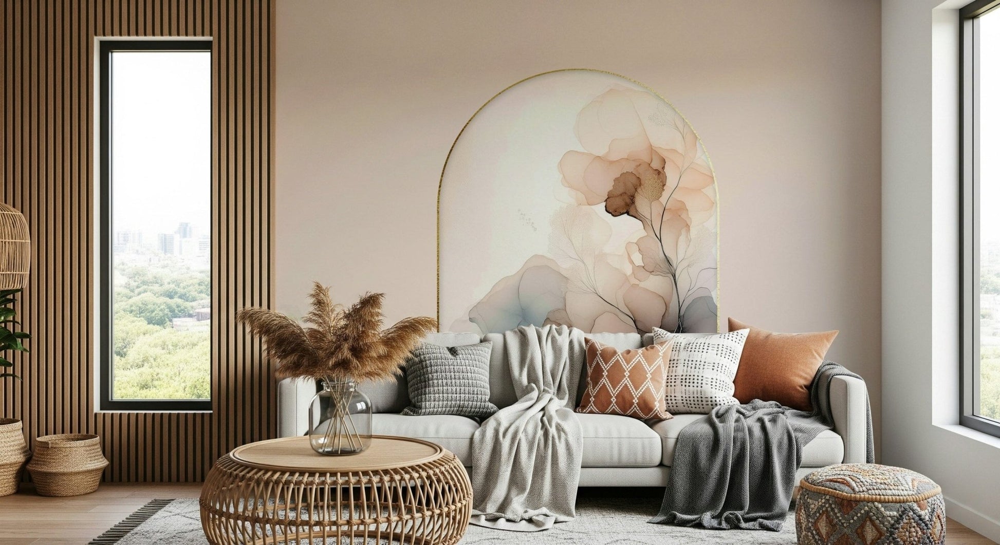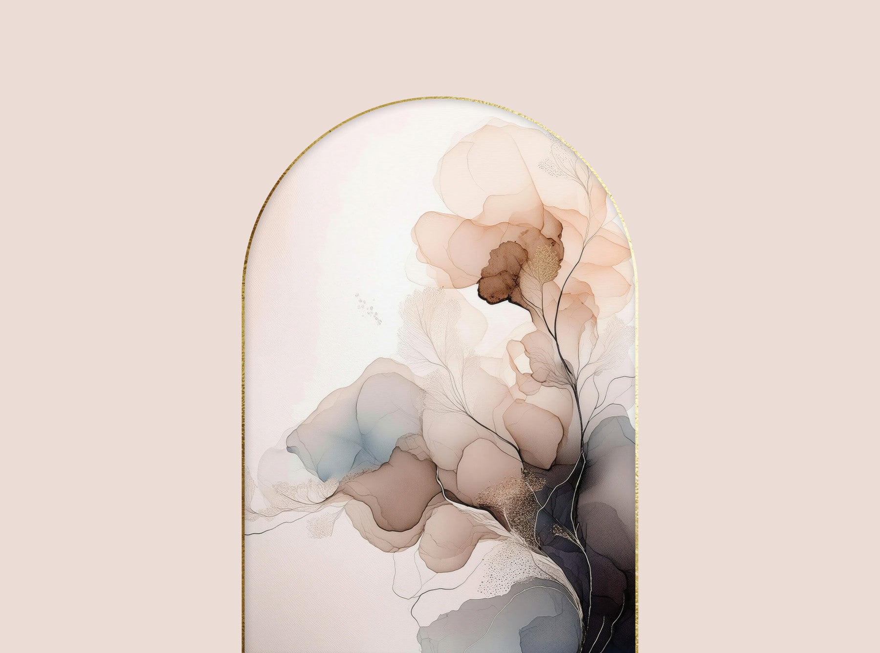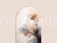 Bring nature's elegance indoors with this captivating wallpaper for walls. The design features dreamy floral elements framed by a delicate golden arch. Soft hues of beige, brown, and blue blend seamlessly, creating a tranquil atmosphere. This design complements living rooms, bedrooms, or hallways, adding a touch of sophistication and organic charm. The flowing lines and subtle shimmer of gold enhance interiors with a soft glow.