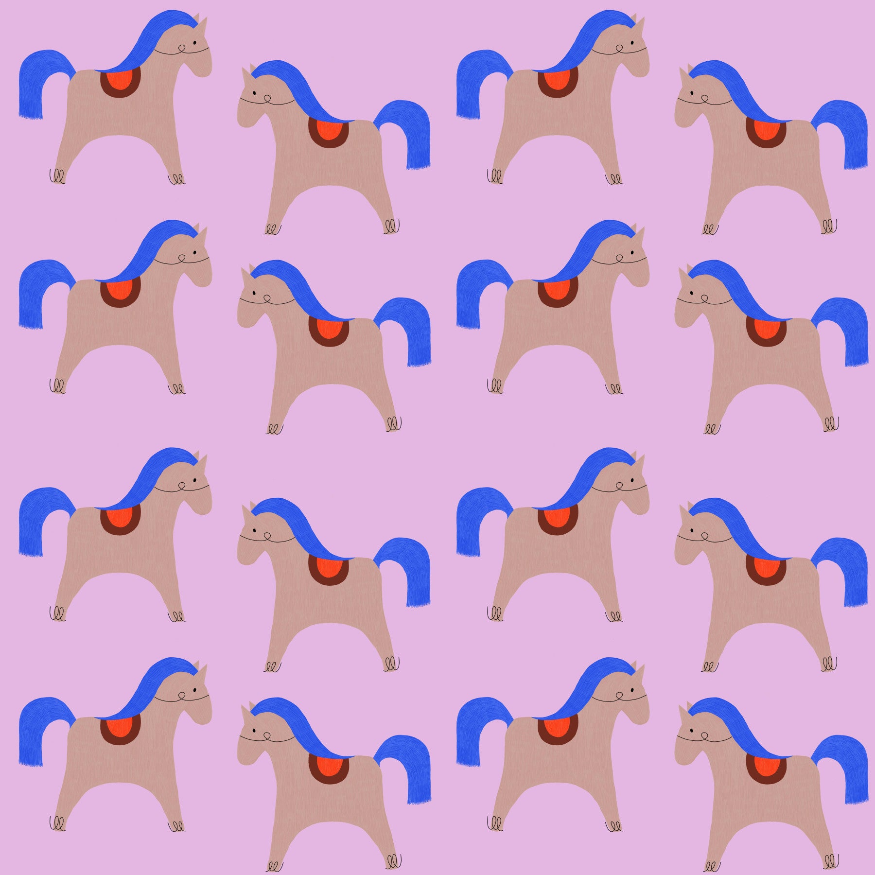 Embrace the whimsical charm of 'Delight Carousel 03,' a delightful wallpaper featuring a repeating pattern of stylized carousel horses. Each horse boasts a vibrant blue mane and tail, contrasting beautifully against its soft, taupe body. A pop of orange and brown on their backs adds a playful touch, reminiscent of a saddle. The pastel lavender background enhances the overall lighthearted and joyful mood, perfect for adding a touch of playful elegance to any digital device.