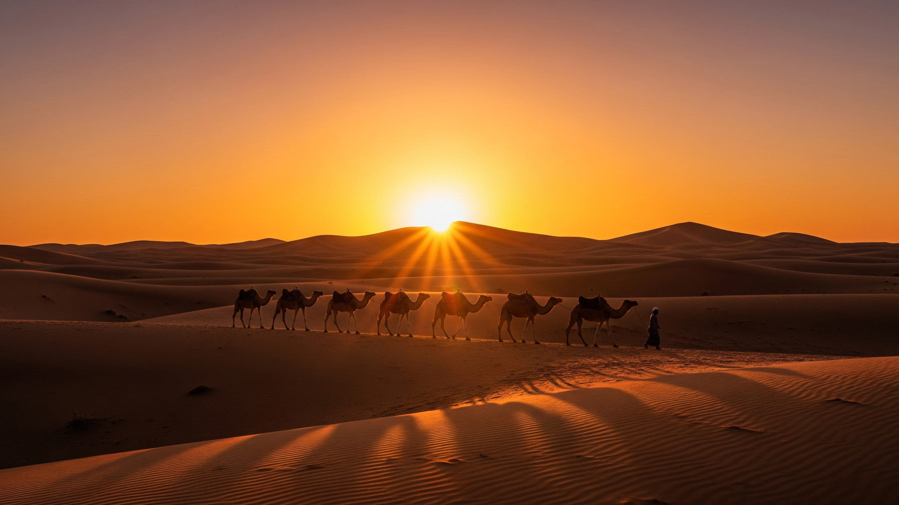 Bring the warmth of the desert into your home with this stunning wallpaper for walls. It displays a caravan traversing sand dunes at sunrise, casting long shadows. Warm oranges and browns dominate, creating a sense of serenity. Install this in a living room, bedroom, or office to enjoy a peaceful environment. The design easily complements rustic, bohemian, and even modern interiors.