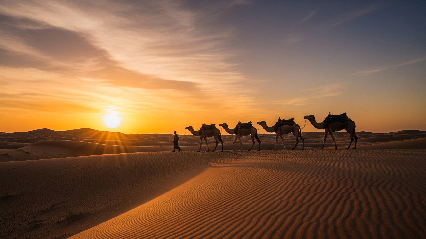 Immerse yourself in the warm glow of the desert sunset. This image displays a caravan trekking across rippled sand dunes beneath a vibrant sky. The rich orange and brown tones create a cozy feel, while the silhouette of the camels adds a touch of adventure. Use this wallpaper for walls to bring a sense of travel and tranquility to your living room, bedroom, or office. It's sure to transform any space into a peaceful escape.