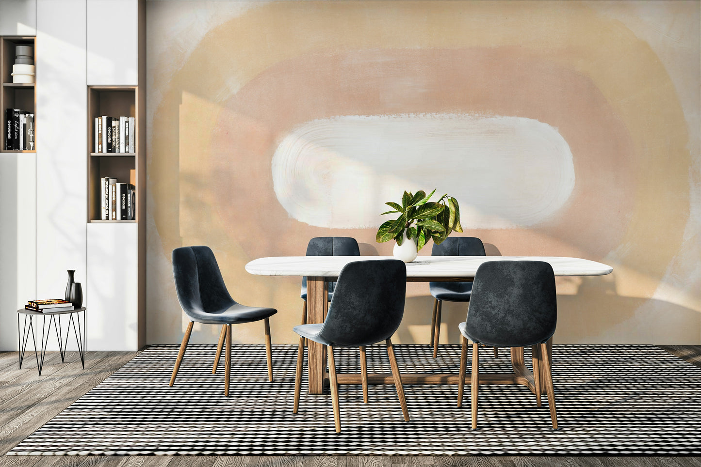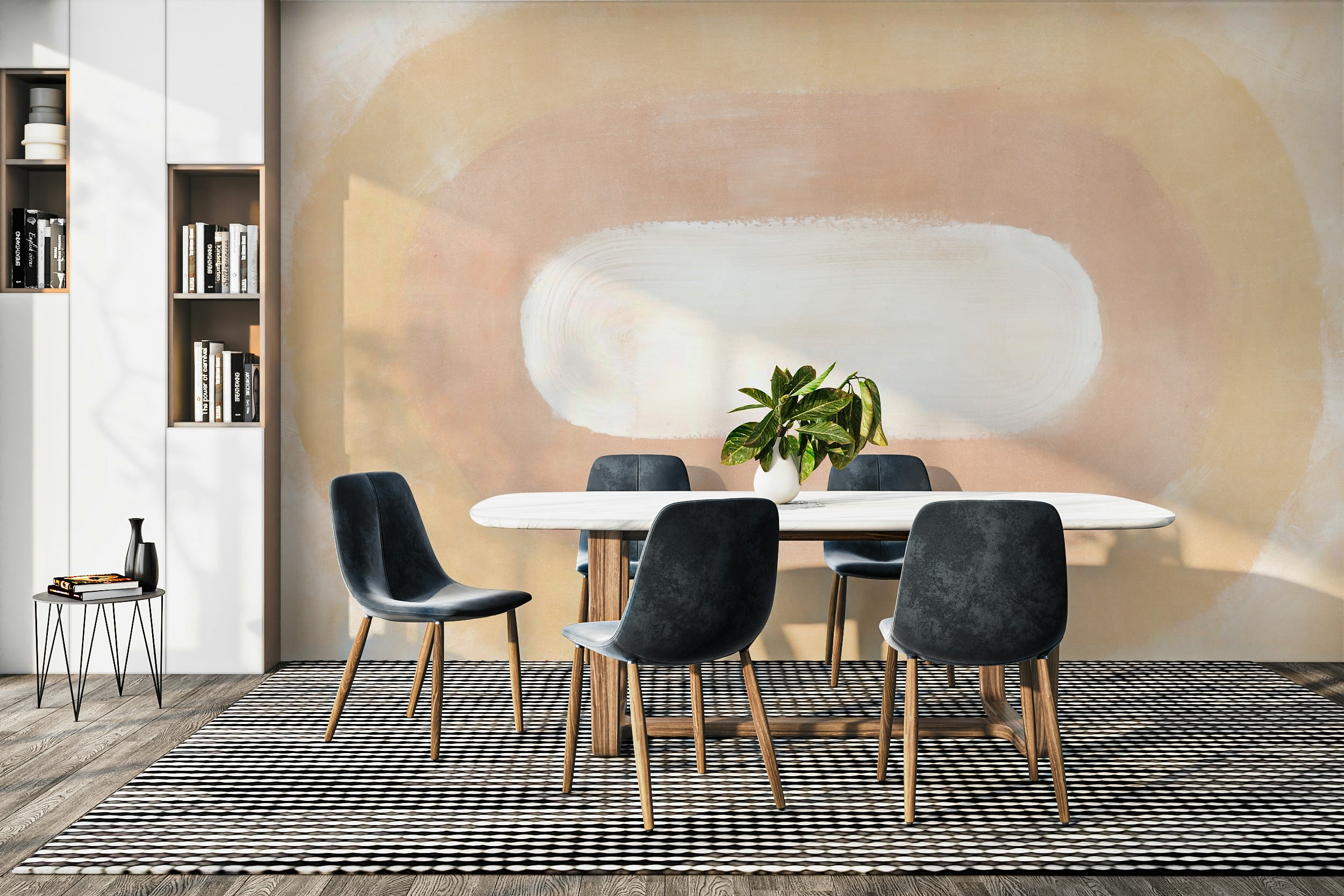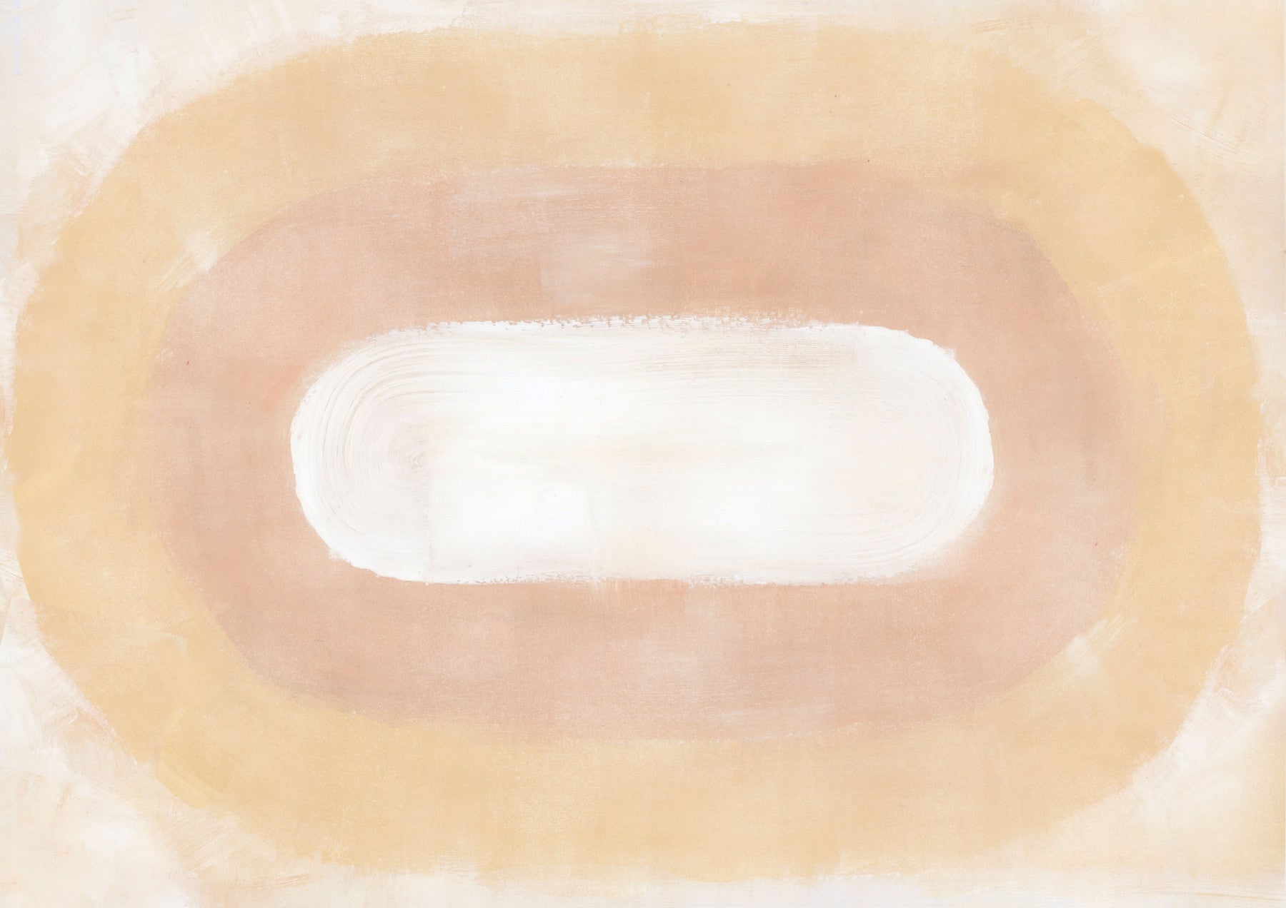 Embrace the serene beauty of the desert dawn with this captivating wallpaper. Soft, earthy tones of beige and blush pink create a breathtaking abstract landscape, evoking the feeling of a sun rising over endless sand dunes. The central white oval, reminiscent of the first light breaking through the horizon, is gently framed by concentric circles of subtly shifting hues. This minimalist yet evocative design brings a sense of calm and tranquility, perfect for adding a touch of desert elegance to your digital space. The textured brushstrokes add depth and visual interest, making it a stunning backdrop for any screen.