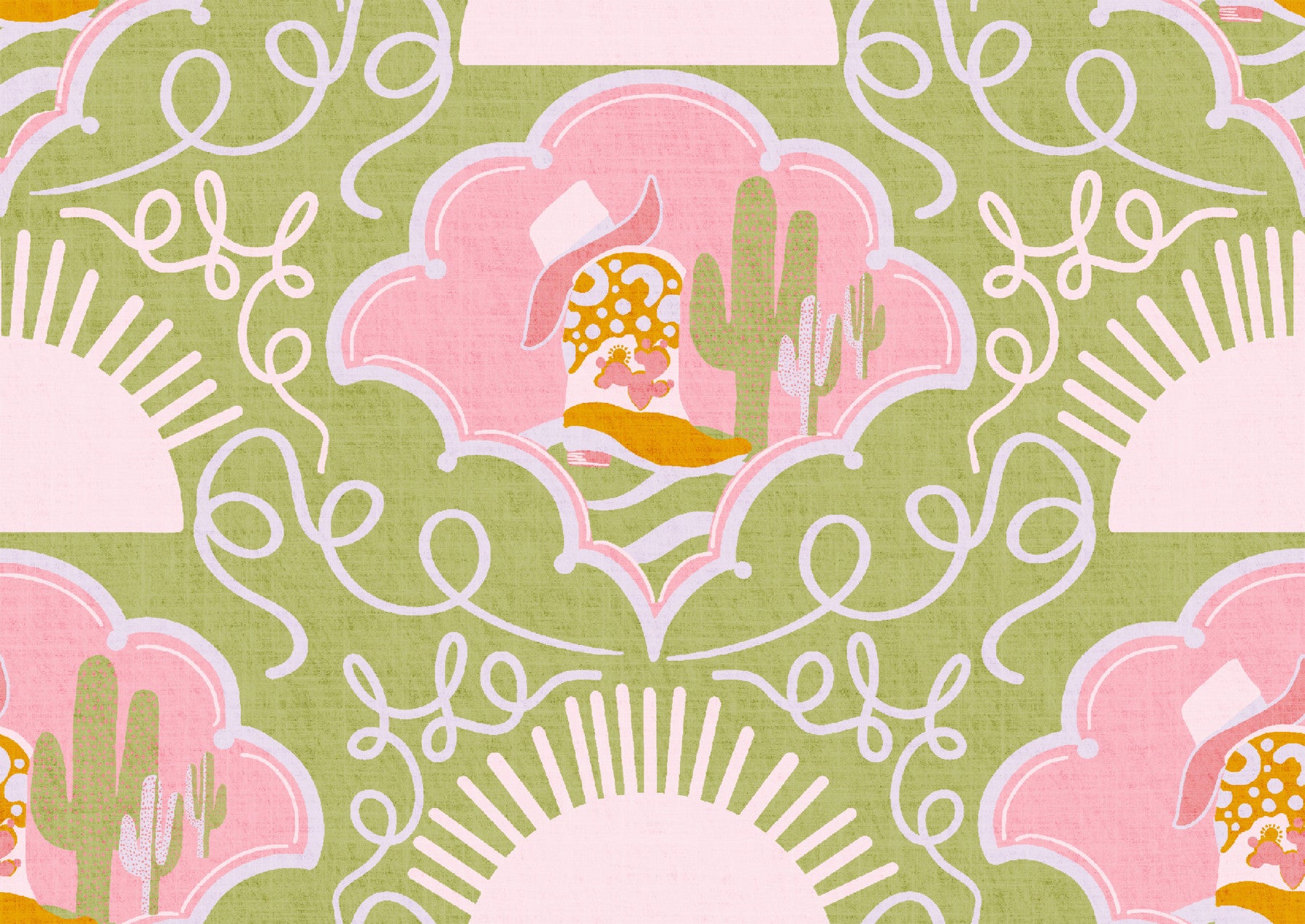 Bring a touch of playful western charm to your space with this delightful wallpaper for walls. The design features cacti, cowboy boots and sun rays framed with ornate curves in a soft colour palette of pinks, greens, and yellows. These colours evoke a retro-inspired feel, creating a cosy atmosphere that can brighten up any room. Consider using it in a kid's room, a hallway, or even a bathroom to add a dose of whimsical personality. The simple shapes will also work well in a retro inspired kitchen.