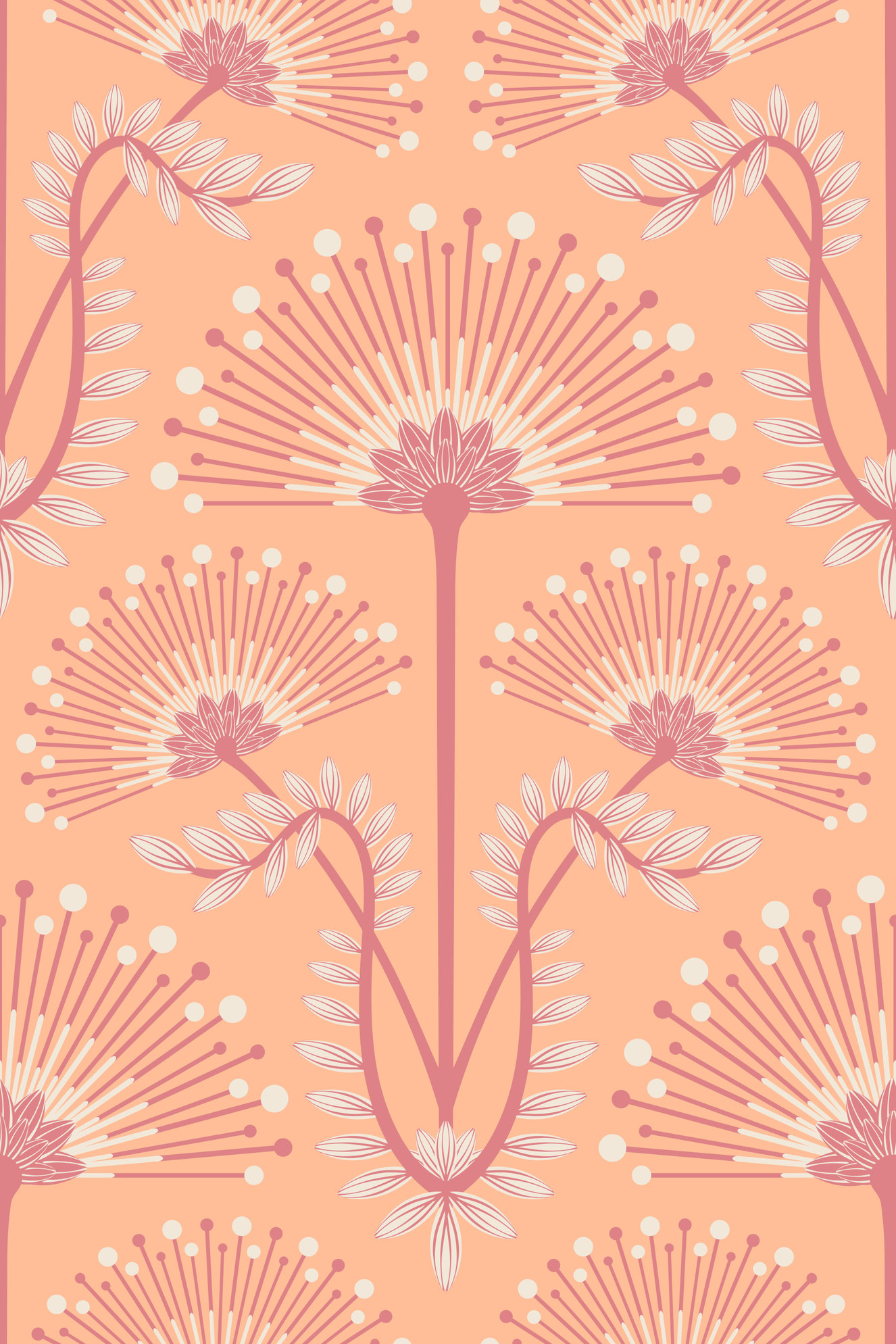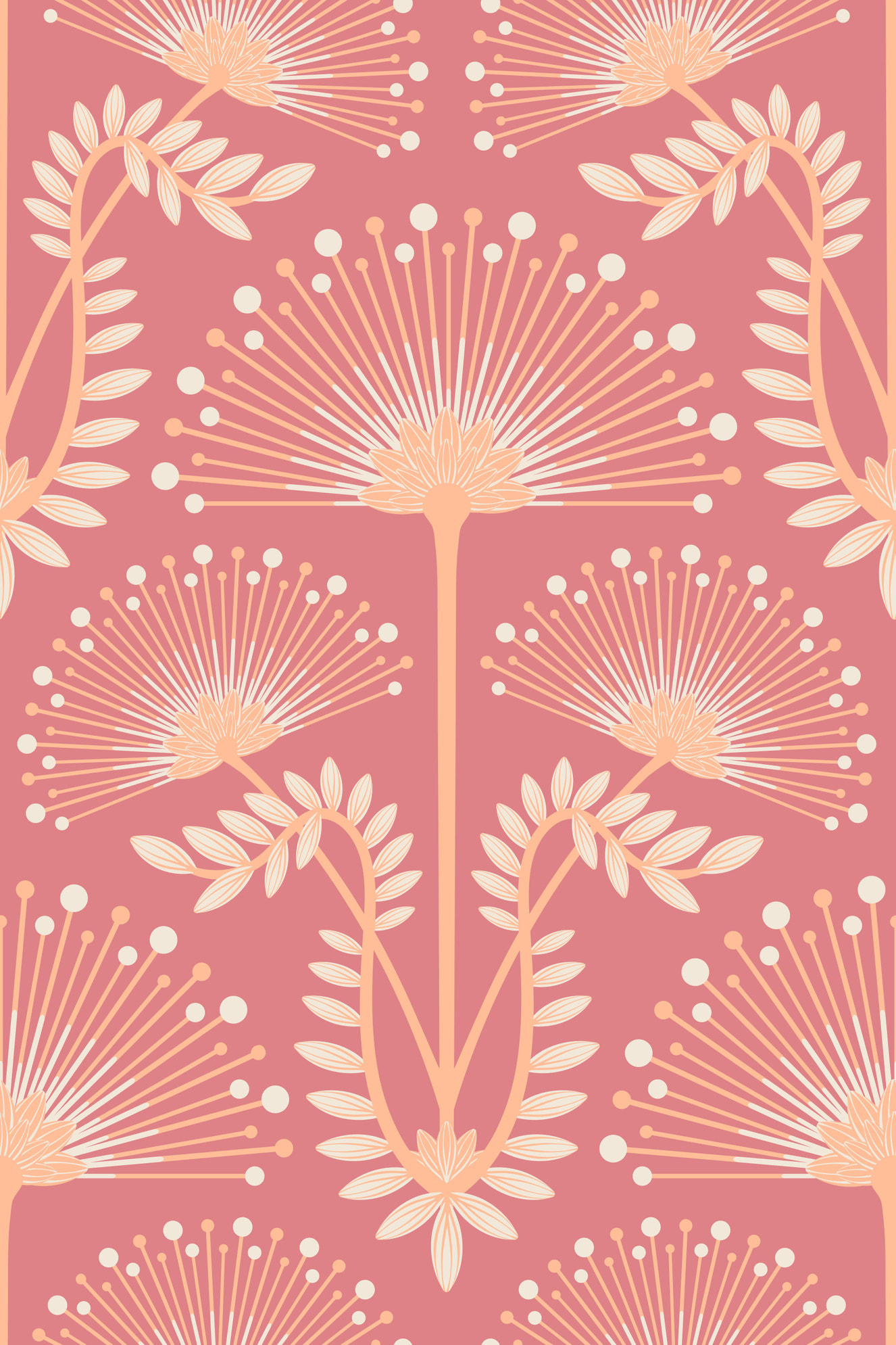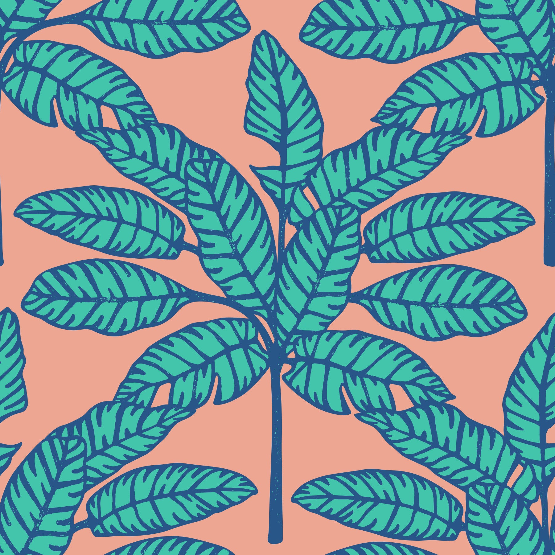 Escape to a vibrant desert oasis with this retro-inspired wallpaper. Stylized tropical leaves in refreshing aqua turquoise and blue burst forth against a warm clay pink backdrop. The mid-century modern aesthetic is perfectly captured through the bold lines and graphic design of the foliage, creating a seamless pattern that evokes a sense of calm and summery escape. This wallpaper is perfect for adding a touch of lush sophistication to any space, bringing a unique blend of desert serenity and tropical exuberance to your spaces. This pattern design is also available in Other Colourways too! Original wallpaper pattern design by Jackie Tahara of UnBlink Studio.