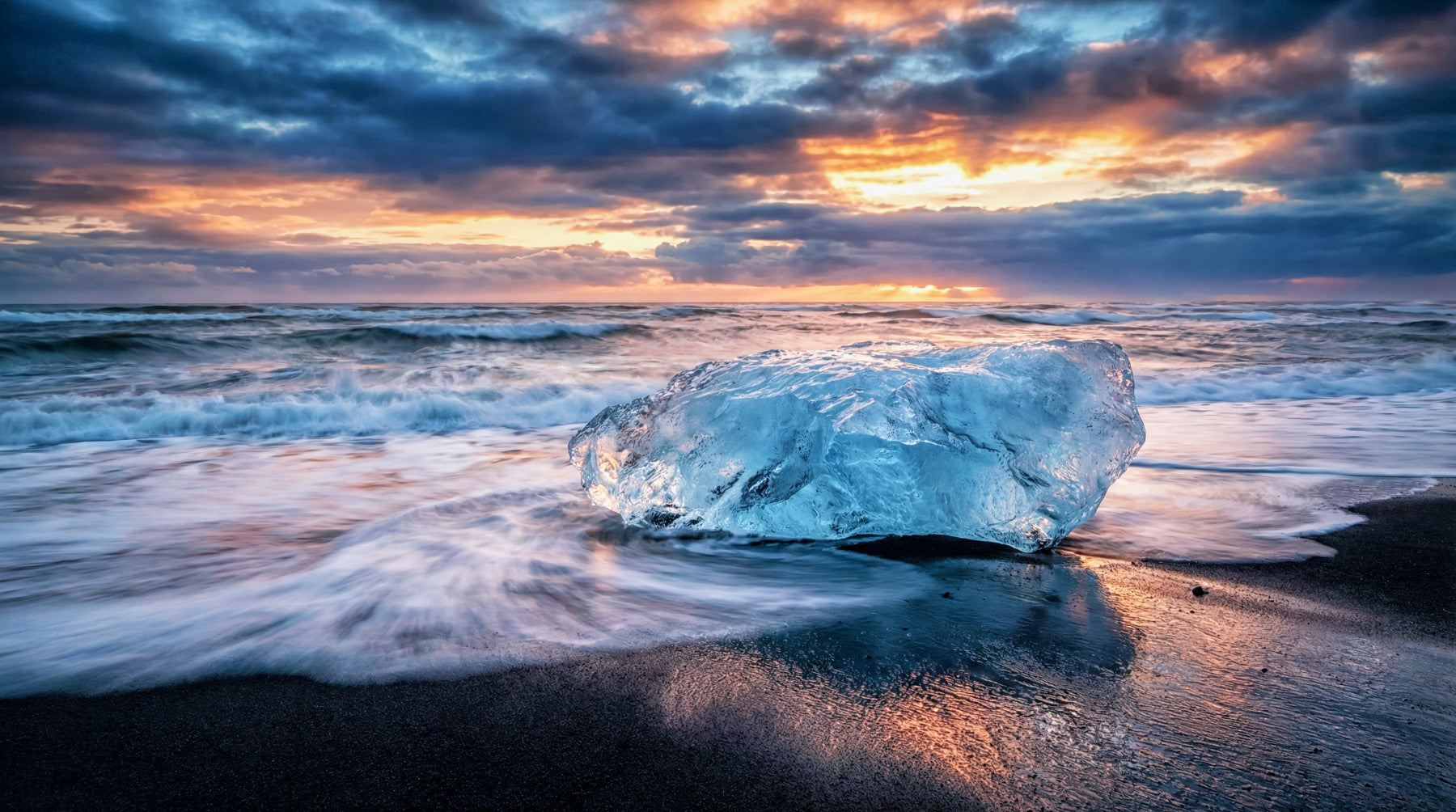 The Diamond Beach Dawn Wall Mural captures the quiet beauty of a coastal morning with striking detail. This design features a large, translucent ice block resting on dark volcanic sand as gentle waves wash over the shore. The sky is filled with a dramatic mix of deep blues and warm orange light from the rising sun, creating a peaceful yet powerful atmosphere. Perfect for modern wall decor, this mural adds a sense of natural wonder to any apartment. It is printed on durable material that preserves the rich color and clarity of the original landscape, providing a lasting focal point for your interior space.