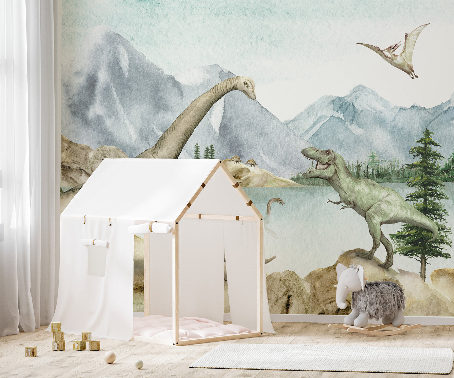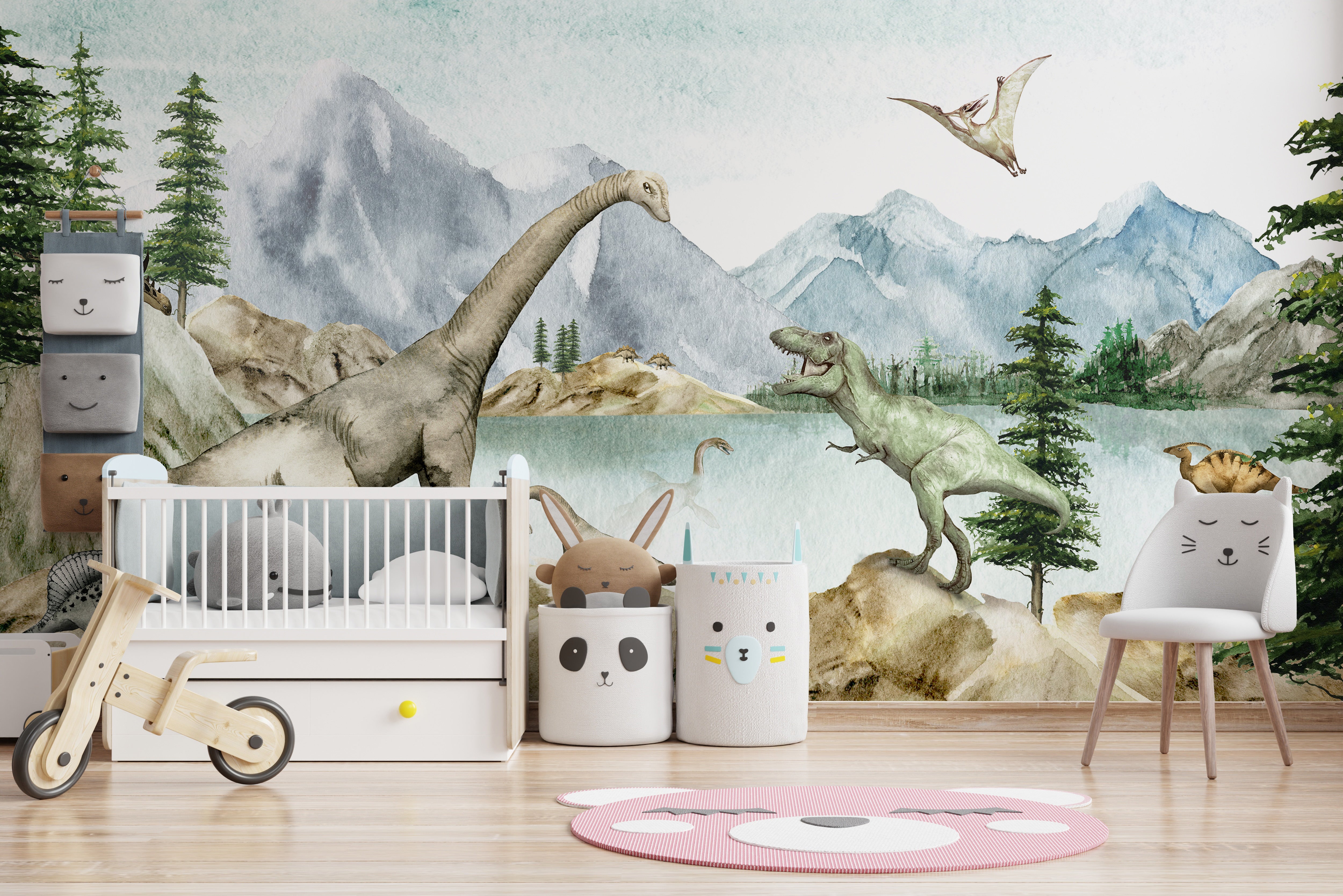 Kids room wallpaper featuring dinosaurs in prehistoric scene