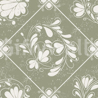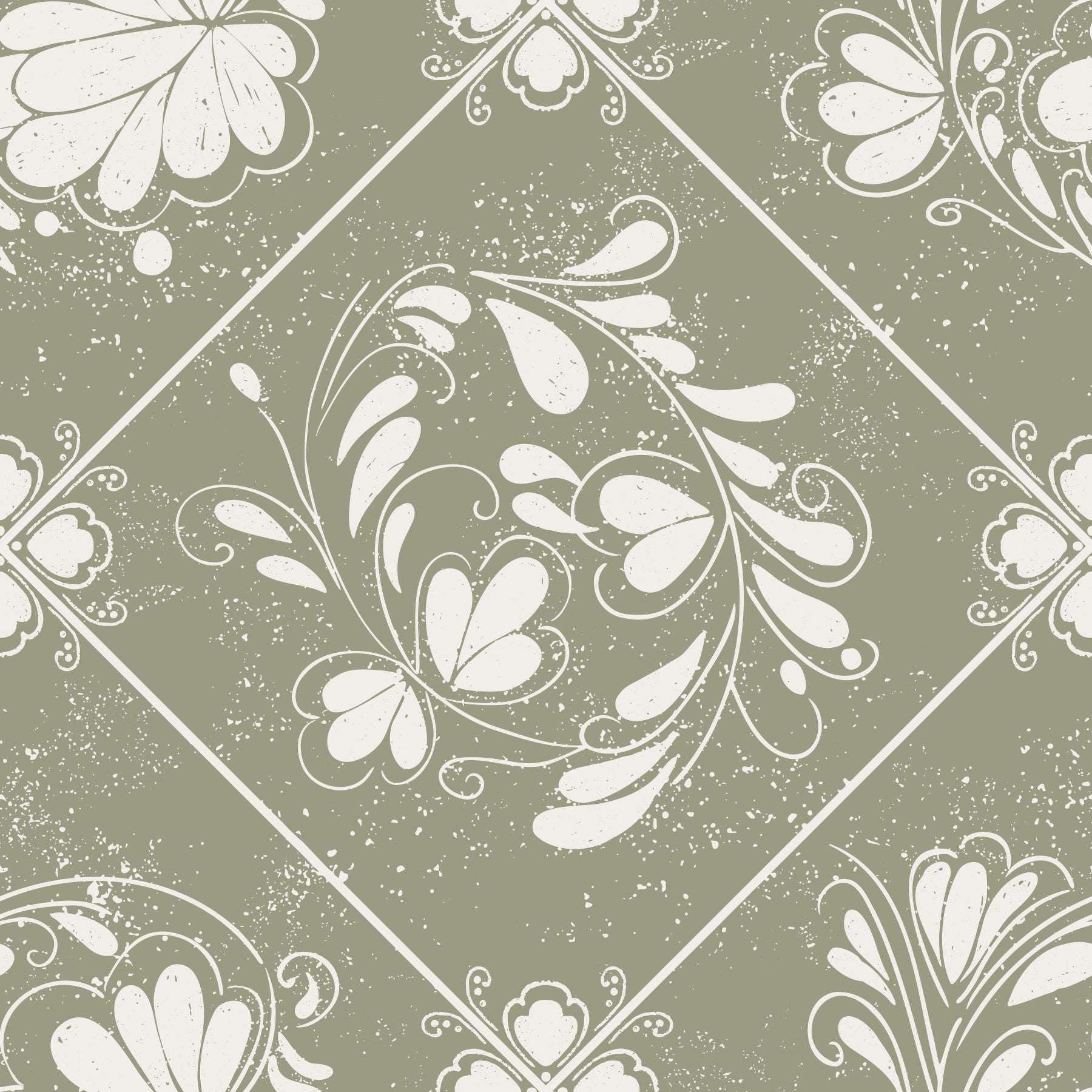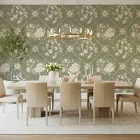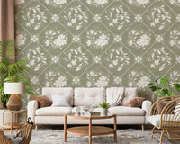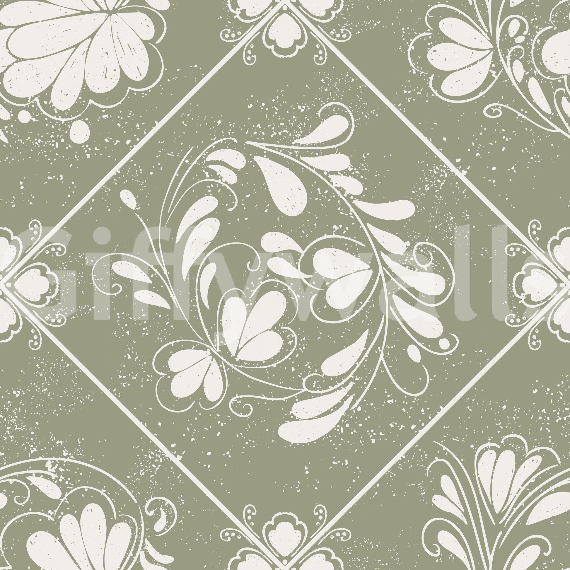 Introduce subtle charm with this elegantly distressed floral wallpaper for walls. The design features a symmetrical floral motif enclosed within a diamond lattice, giving your walls a vintage yet stylish appearance. Creamy white blooms and swirling foliage pop against the soft, muted green background. The aged effect adds a tactile quality, enriching any room with character and depth. It's ideal for hallways, living rooms, or bedrooms seeking a touch of rustic refinement. This design complements both modern and classic interiors, lending a cosy and sophisticated atmosphere.