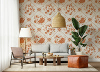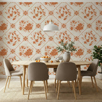 Bring timeless elegance to your home with this sophisticated wallpaper for walls. Featuring a distressed print that gives it an authentic antique appearance, its tile-inspired design showcases terracotta floral motifs against a creamy beige background. This wallpaper adds a touch of classic charm to any interior. The repeating square pattern creates a subtle and visually appealing backdrop for your furniture and decor. The textured appearance adds depth. You can use this in kitchens and dining rooms for a warm, rustic aesthetic. This paper enhances the ambience of your spaces.