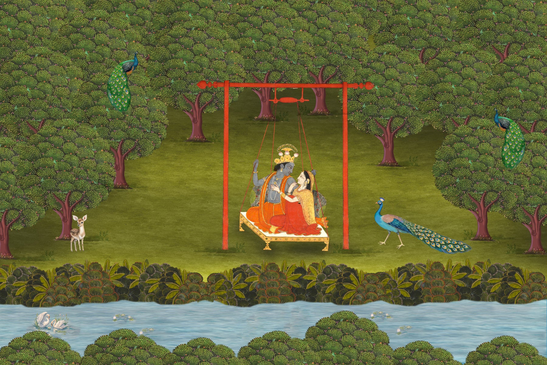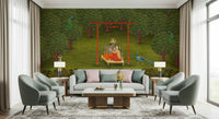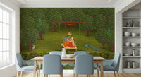 Transform your interior with this idyllic wallpaper for walls. The intricate design features a serene scene of figures on a swing amidst a lush, verdant landscape. Peacocks, swans, and a deer complete the tranquil picture. The vibrant hues of orange, green, and blue create an inviting and warm ambiance. Ideal for living rooms, bedrooms, or hallways, this design brings a touch of classic elegance to your home. Its rich detail adds a layer of sophistication, complementing both modern and traditional décor styles, and inspiring peaceful moments within your space.