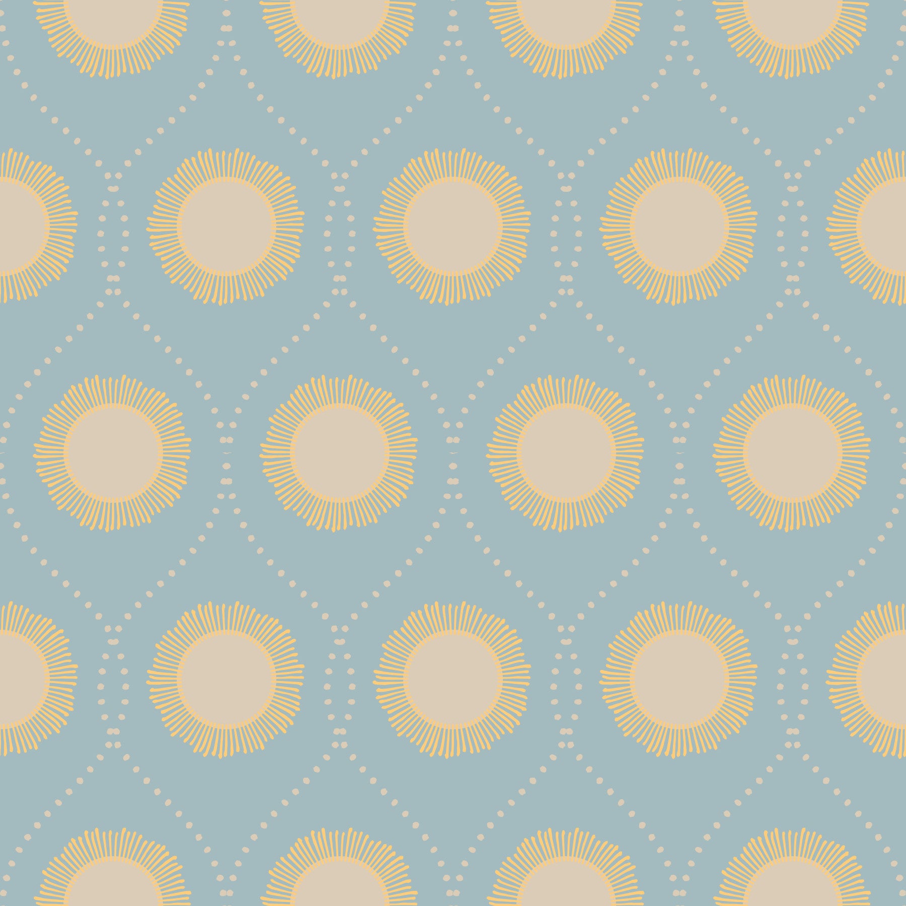 Invite a fresh, airy feel into your home with this charming dotted diamond design. The wallpaper features stylized sun-like shapes, evenly spaced, in a soft beige hue. It also displays a pale blue backdrop, creating a tranquil atmosphere. This wallpaper for walls finds its ideal placement in living rooms or nurseries. The understated design and gentle colours blend beautifully with various interior styles, crafting a space that feels both modern and comforting.