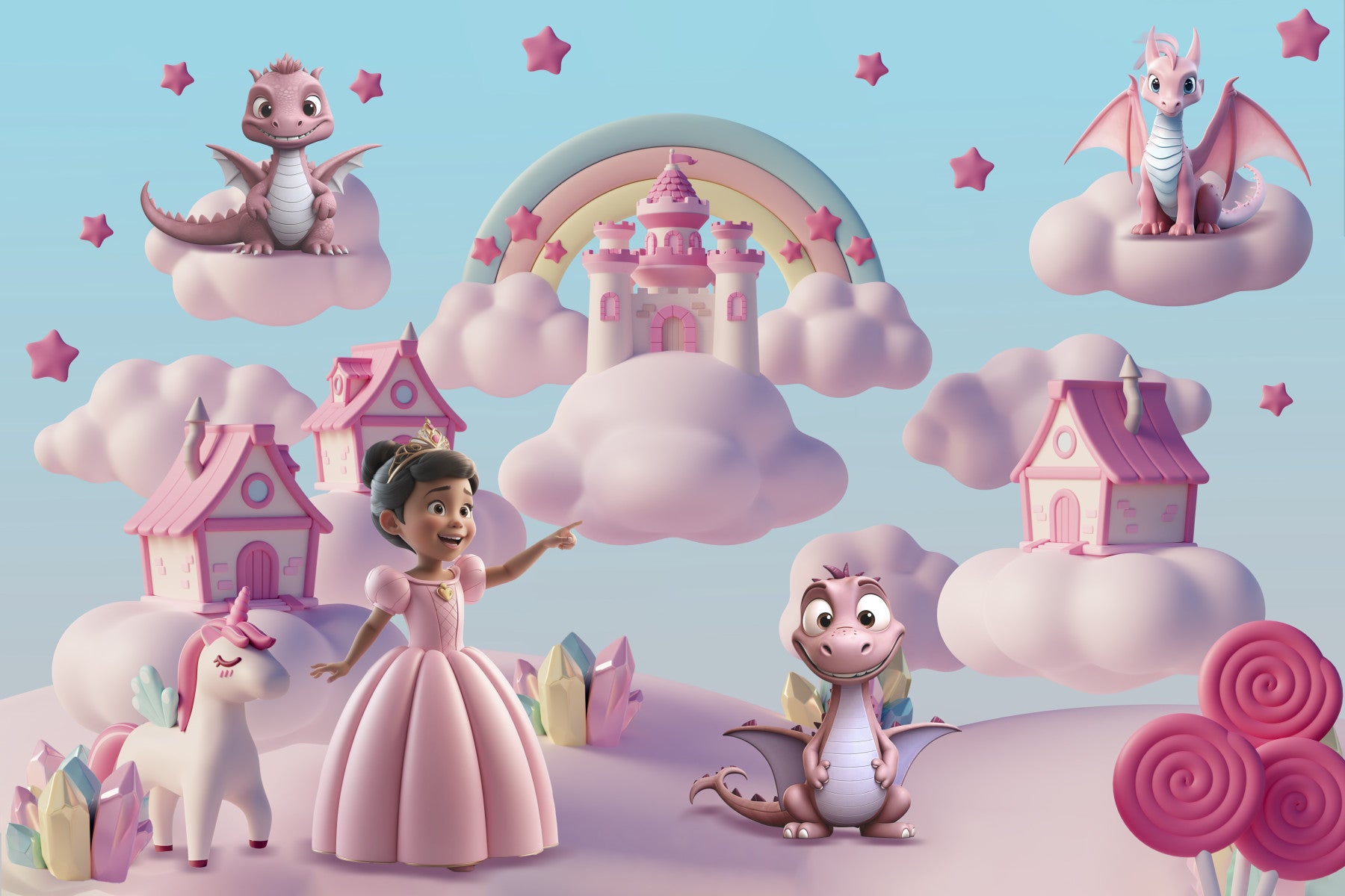 Enter a world of dreams with this playful wallpaper for walls. The design showcases a sweet landscape with pink dragons, a princess, and a candy castle floating among soft clouds. The pastel color scheme creates a calm and enchanting ambiance. Use this wallpaper in a nursery or playroom to spark imagination. It works wonders in bedrooms, especially for kids who love fairy tales. The design complements interiors with a touch of fantasy and color.