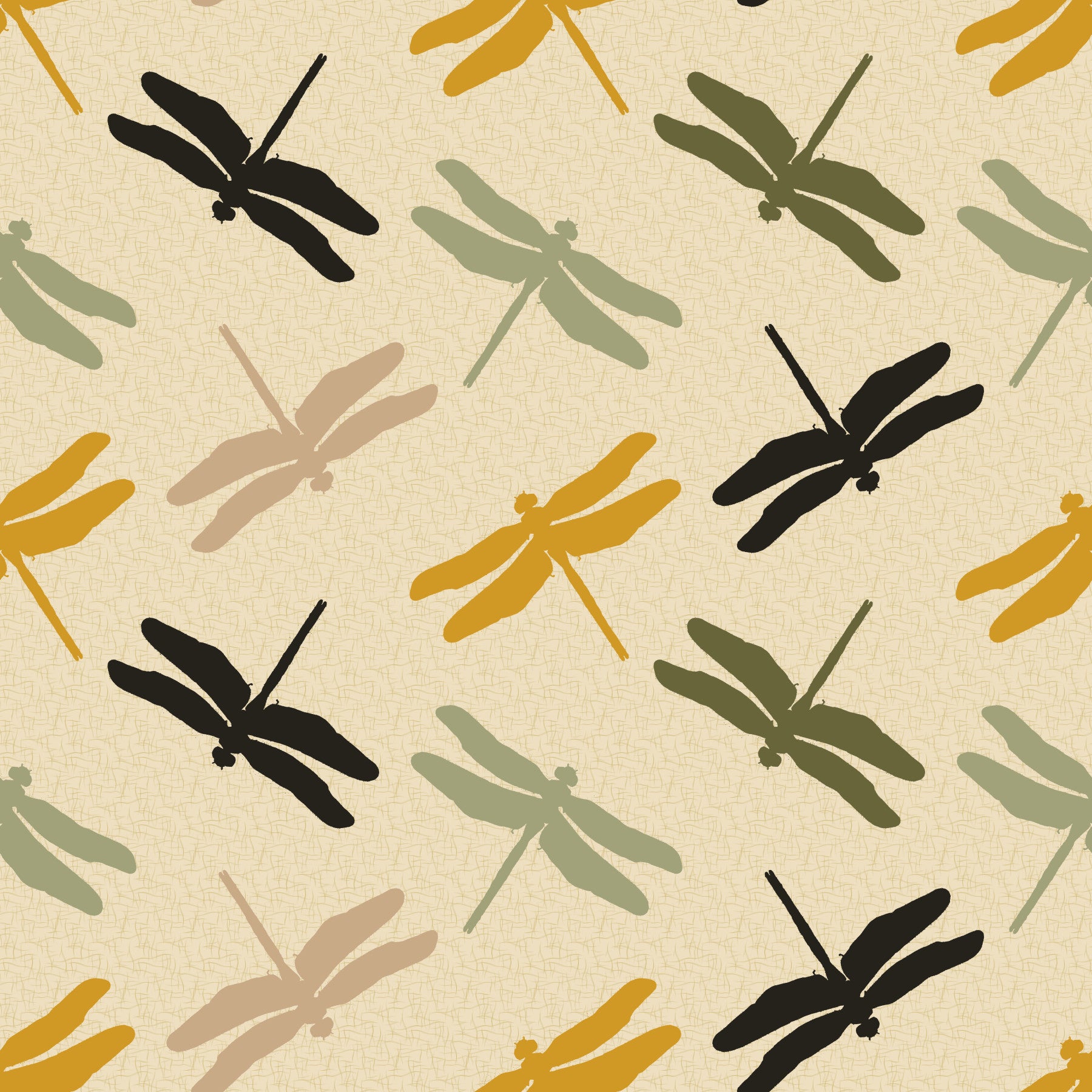 This wallpaper features a captivating array of stylized dragonflies in a muted mustard green palette. The design boasts a calming, earthy aesthetic, achieved through a subtle textured background and a repeated pattern of elegant dragonfly silhouettes in varying shades of black, olive green, beige, and golden mustard. The simplistic yet sophisticated design creates a tranquil mood, perfect for a home office, bedroom, or any space seeking a touch of nature-inspired serenity. The repeating pattern ensures a cohesive and visually pleasing aesthetic, while the varied dragonfly colors prevent monotony, adding a dynamic element to this serene wallpaper.