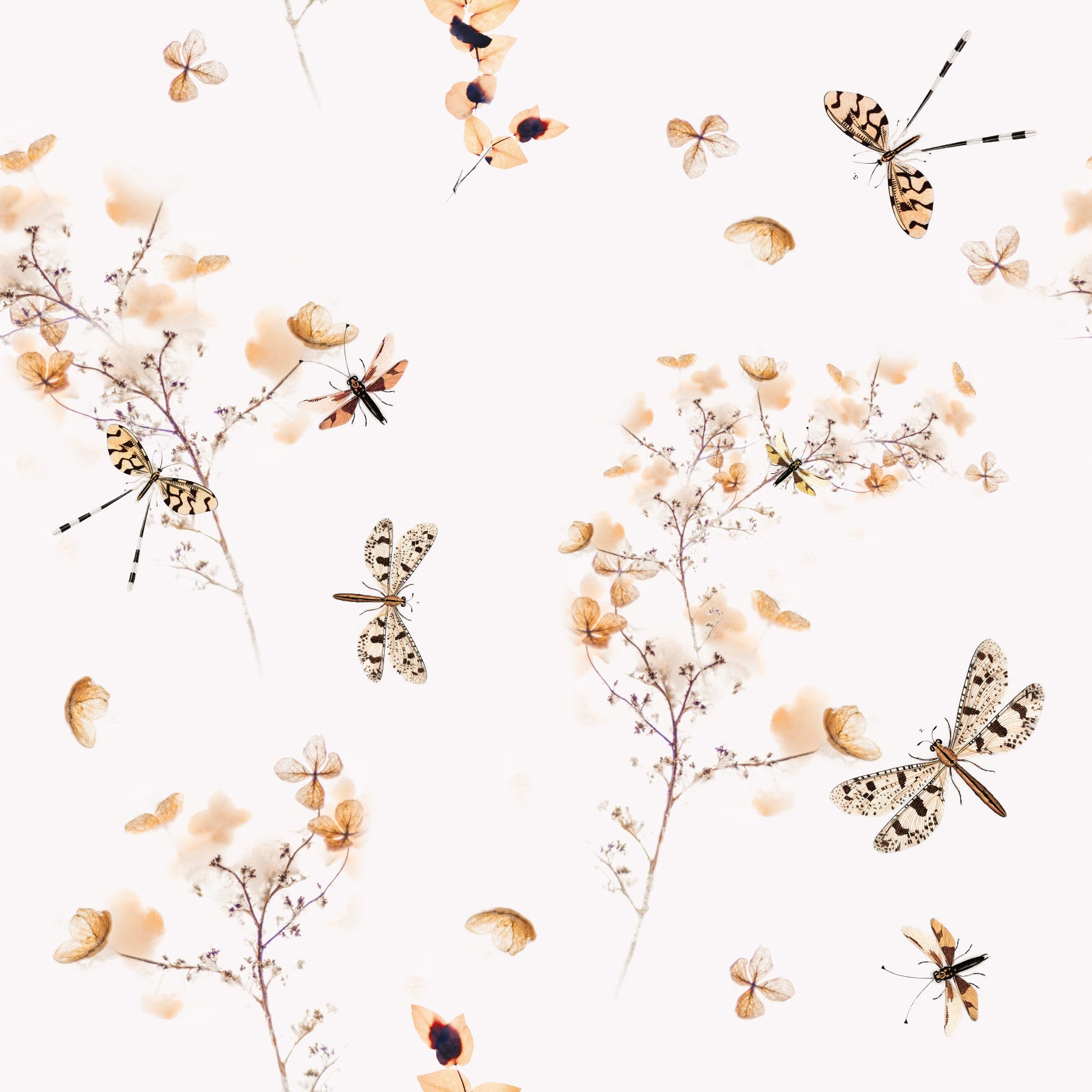 Invite a sense of delicate beauty with this ethereal wallpaper. Soft, diffused tones of beige and amber gently blend together, highlighting the intricate details of dried botanicals and winged insects. This wallpaper for walls creates a serene atmosphere, perfect for bedrooms, living rooms, or hallways. The subtle design ensures it complements a range of interior styles, from minimalist to traditional, adding a touch of refined charm without overpowering your existing decor.