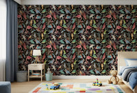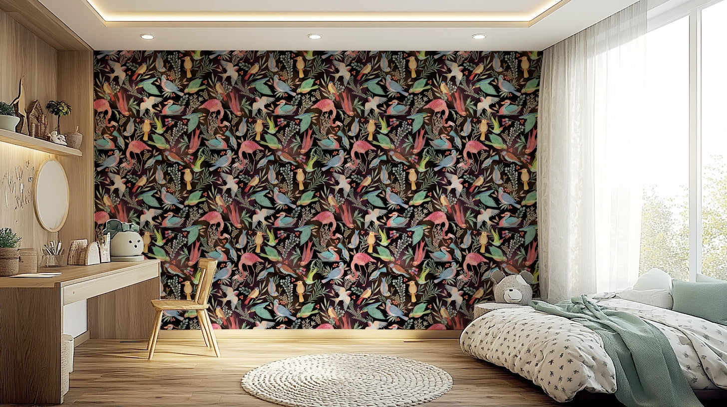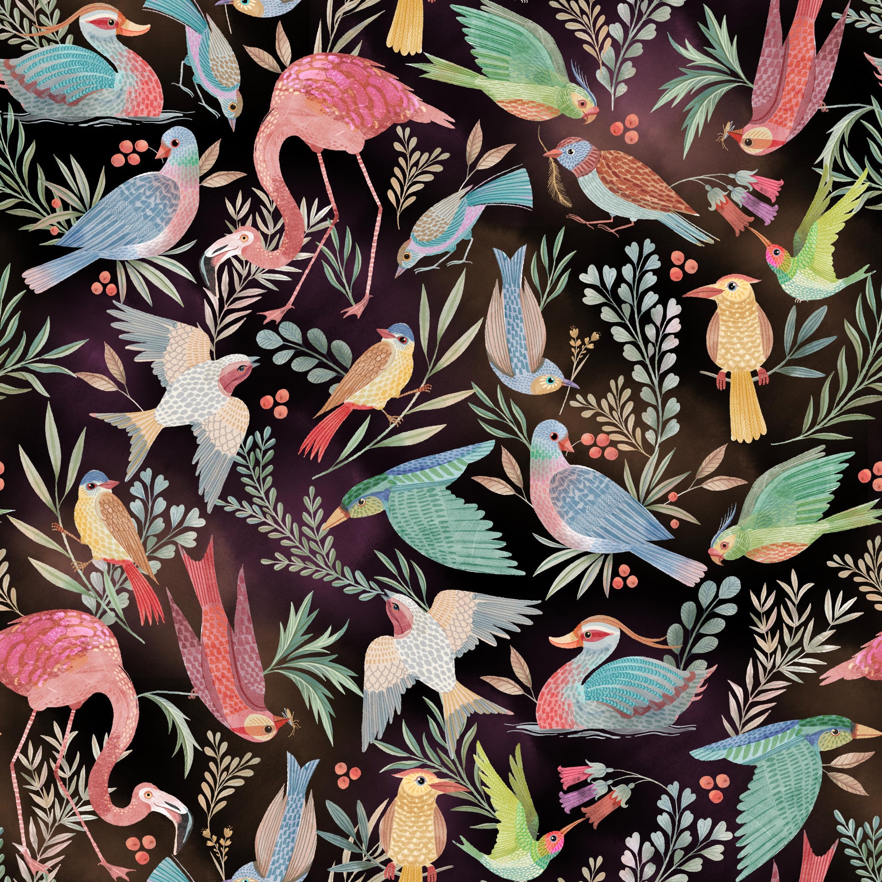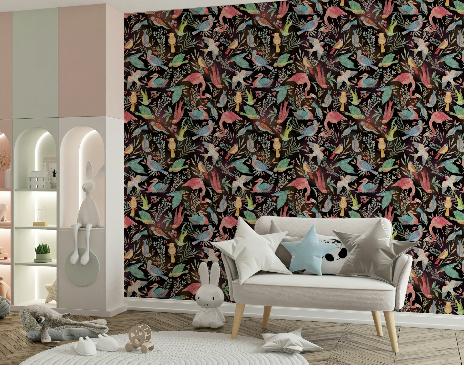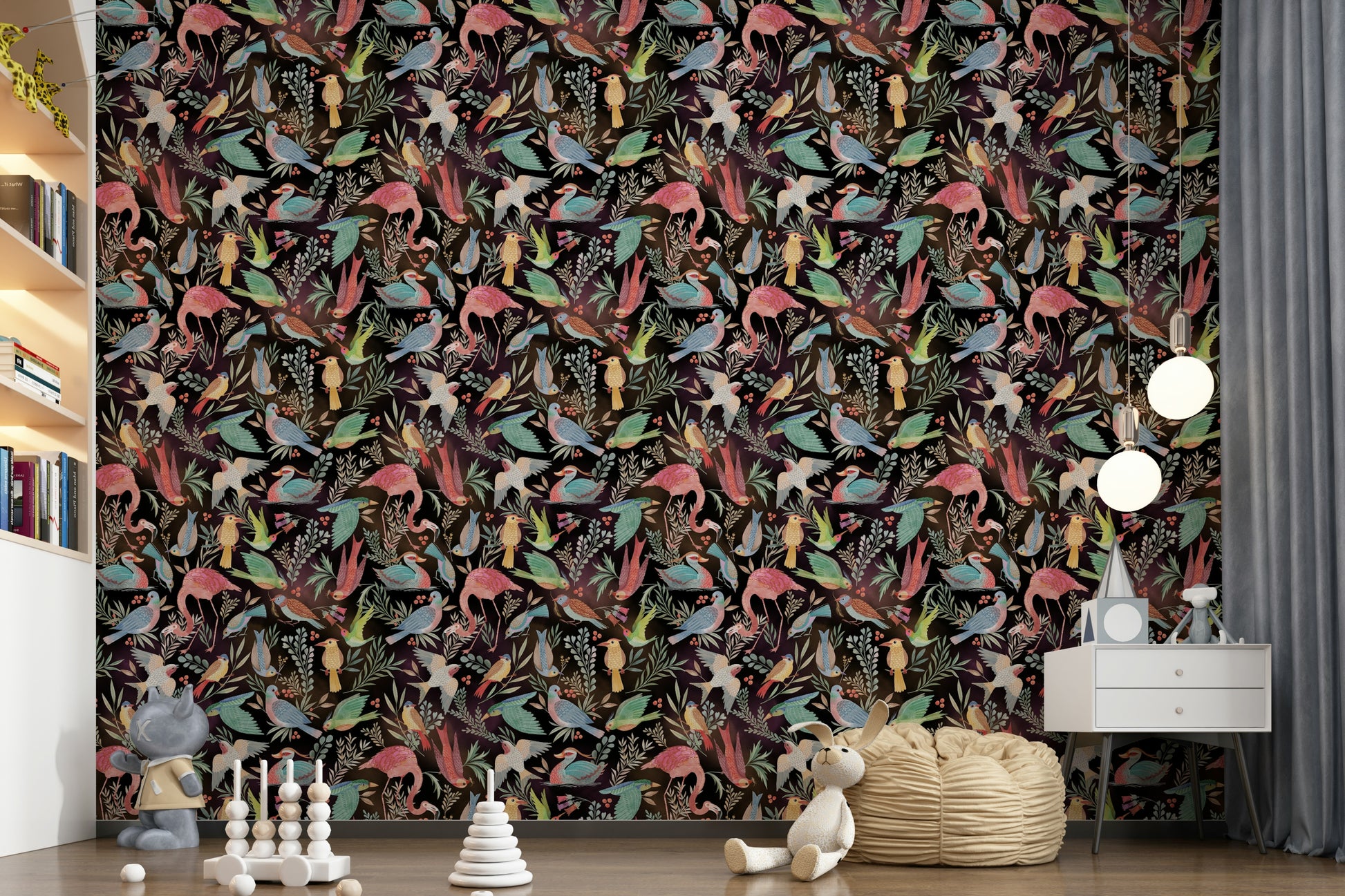 Embark on a nocturnal avian adventure with "Dream Dark Birdwatcher's." This captivating wallpaper showcases a vibrant tapestry of exotic birds—flamingos, hummingbirds, and ducks—rendered in a dreamy, watercolour style against a rich, dark background. Intricate floral details intertwine with the feathered creatures, creating a surreal and enchanting scene. The colours are both bold and muted, offering a unique blend of fantasy and elegance. Perfect for adding a touch of whimsical mystery to any digital device.