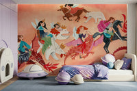 Enter a world of whimsical dreams with this delightful wallpaper for walls. Fairies and royals ride dragons, horses, and polar bears through the night sky. The hand-drawn style and soft, comforting colours of pink, beige, red, and blue make this wallpaper perfect for a child's bedroom or nursery. The fantasy theme brings a playful touch, blending seamlessly with both modern and classic interior styles. Let the story unfold on your walls.
