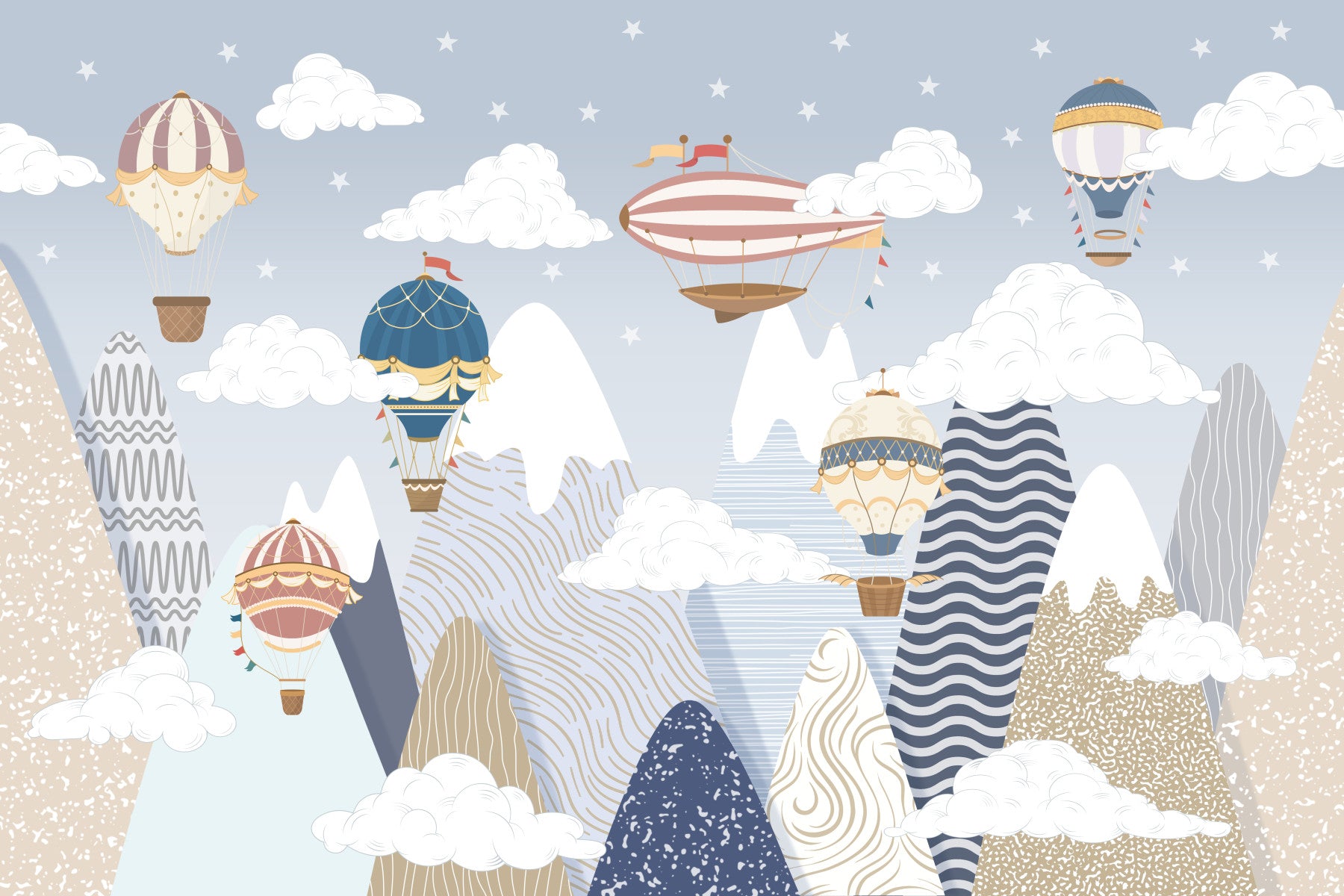 Set the stage for imagination with this delightful wallpaper for walls. The design features whimsical airships and balloons soaring above stylized mountains and puffy clouds. Its muted blues, soft browns, and creams lend a serene feeling. This wallpaper fits perfectly in a children's bedroom, playroom, or reading nook. The gentle patterns complement both modern and traditional furnishings. Let this design spark exciting stories.