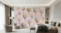 Whimsical wall mural featuring colorful hot air balloons floating across a dreamy sky.