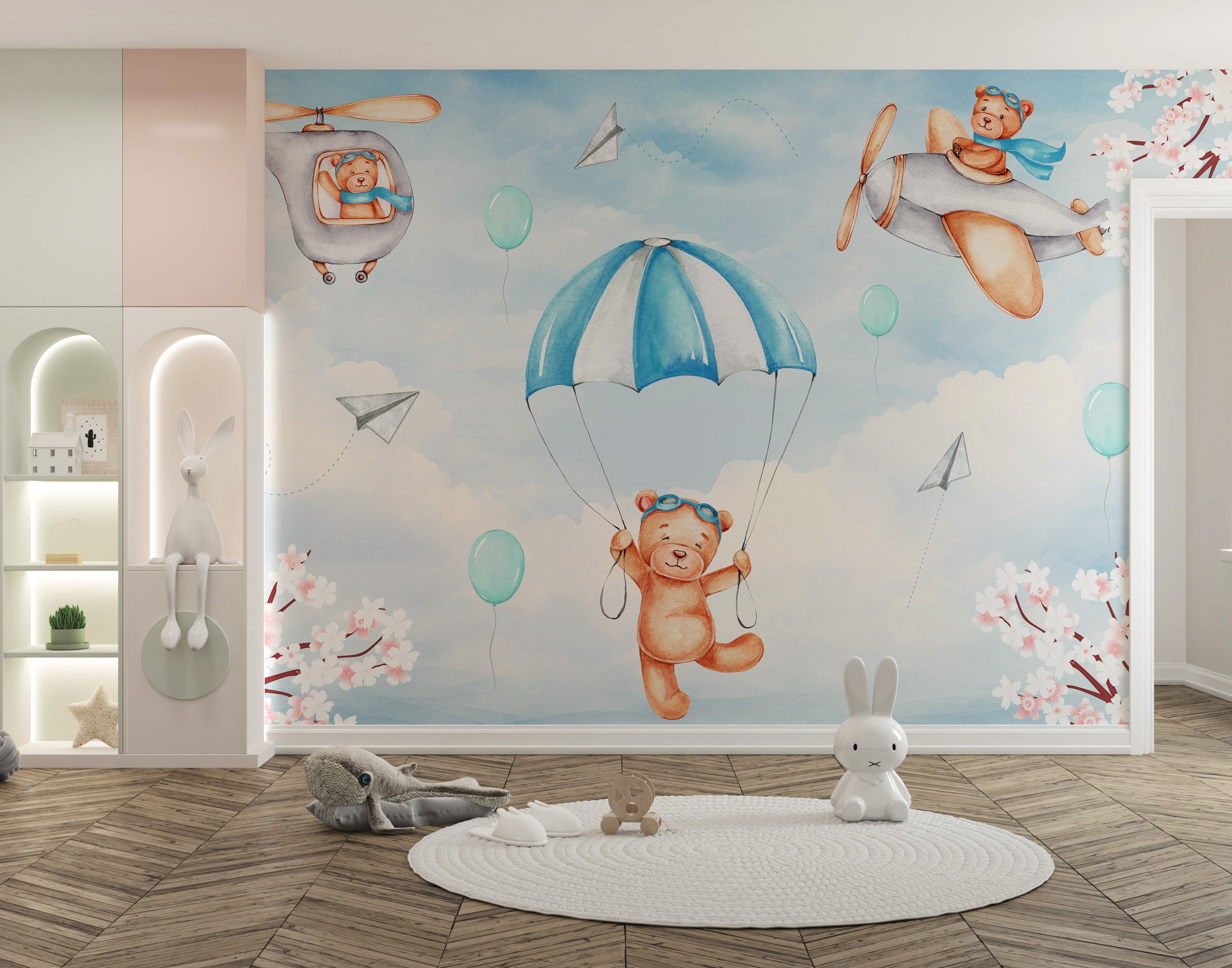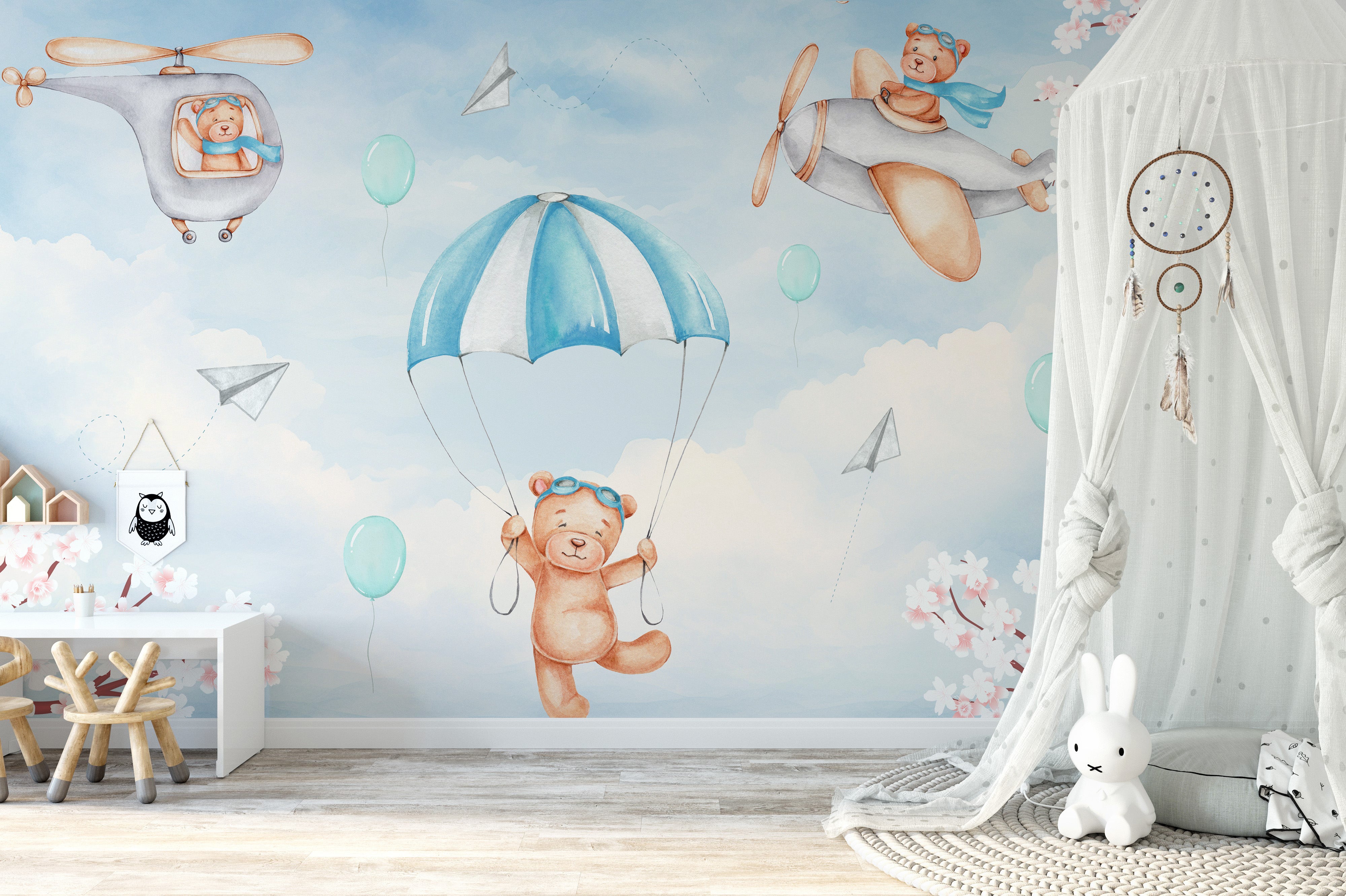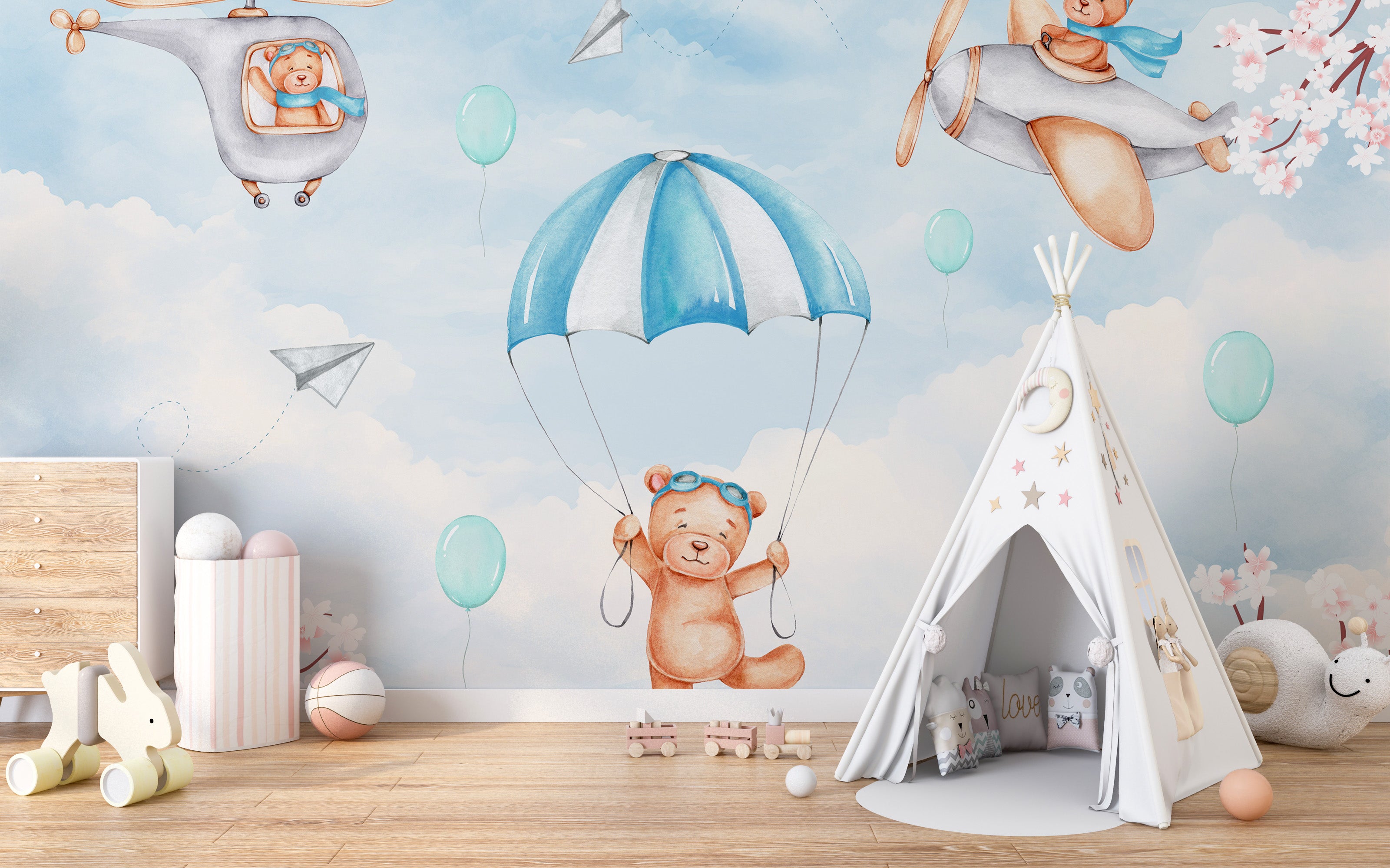 Our dreamy sky adventure wall mural collection sweeps your child into a vibrant world of imagination where teddy bears pilot planes among the clouds. Perfect for kids who dream of high-flying adventures, this kids wallpaper is designed to endure the excitement of childhood while being simple to clean and maintain. With a palette that stimulates both study and play, our murals offer a blend of education and entertainment. Shop for our wide range of designs today and gift your child a daily dose of adventure, shipped directly to your door with our complimentary Free Shipping service. Shop for our range today and transform your child's bedroom into a sky high adventure!