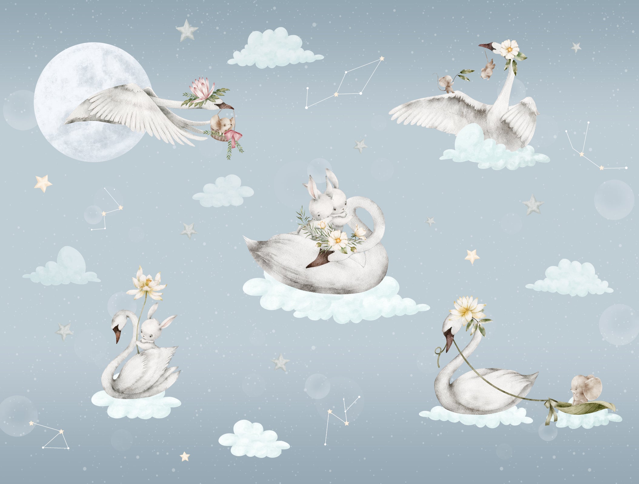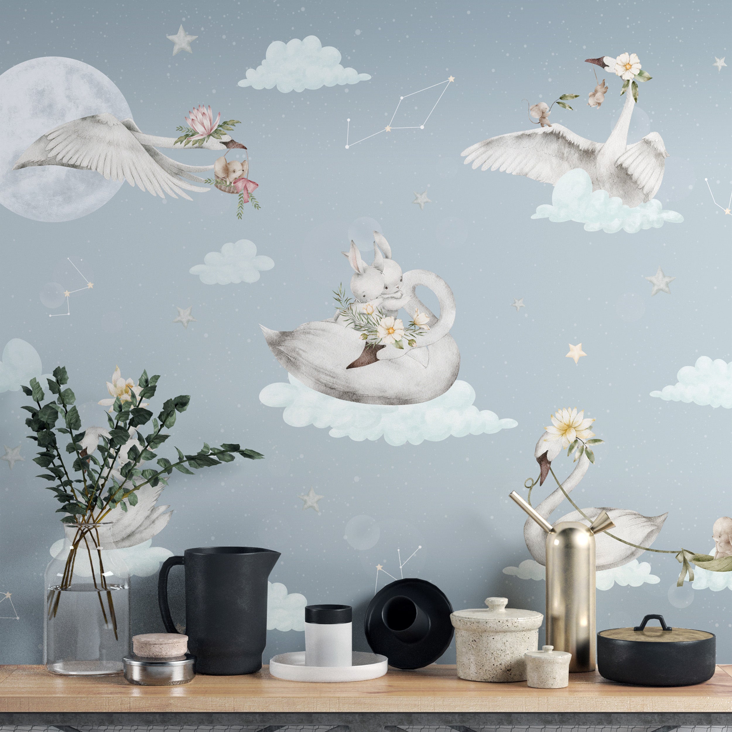 The dreamy swan & bunny wallpaper brings a serene charm to any nursery or kids' room. Delicate swans glide across a soft blue sky, carrying playful bunnies on floating clouds. The gentle hues and celestial elements create a magical setting, perfect for a peaceful atmosphere. Designed with a watercolor touch, this swan wallpaper blends elegance with whimsy. Stars and constellations add a celestial feel, making bedtime a dreamy escape. The high-quality material ensures durability while offering a soothing aesthetic. Ideal for creating a starry night wallpaper effect, this design turns walls into a fairytale-inspired wonderland with graceful swans and charming rabbits.