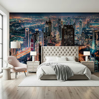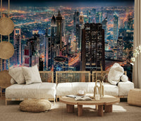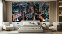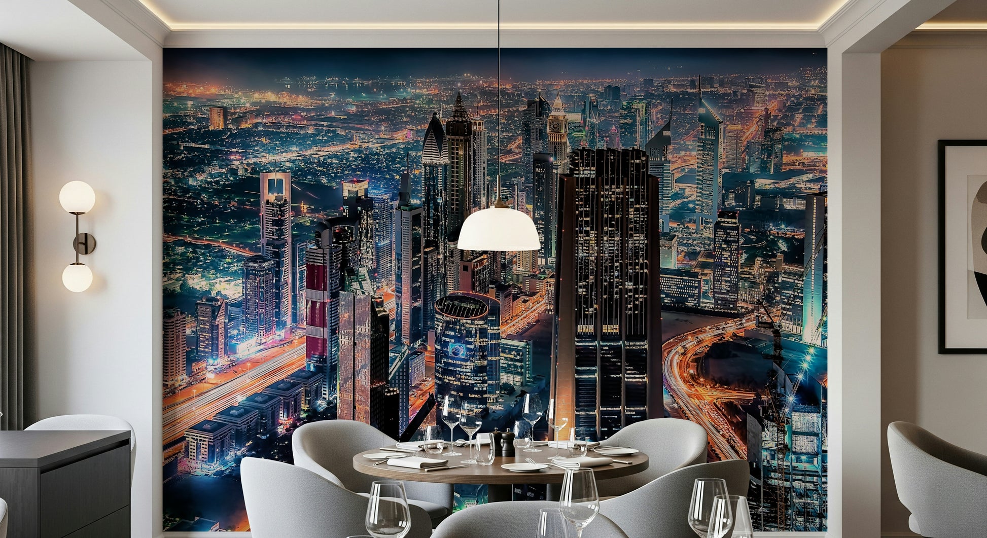 Transform your interior with this striking cityscape. The sharp definition captures the vibrant energy of Dubai at night. This wallpaper for walls showcases towering buildings, glowing with light and connected by bustling highways. The colour palette combines cool blues and warm oranges, creating an inviting atmosphere. It works great in a living room, home office, or hallway, adding depth and sophistication. The design complements modern and industrial spaces. It infuses energy and visual interest into bland interiors, creating a statement wall that becomes a focal point.