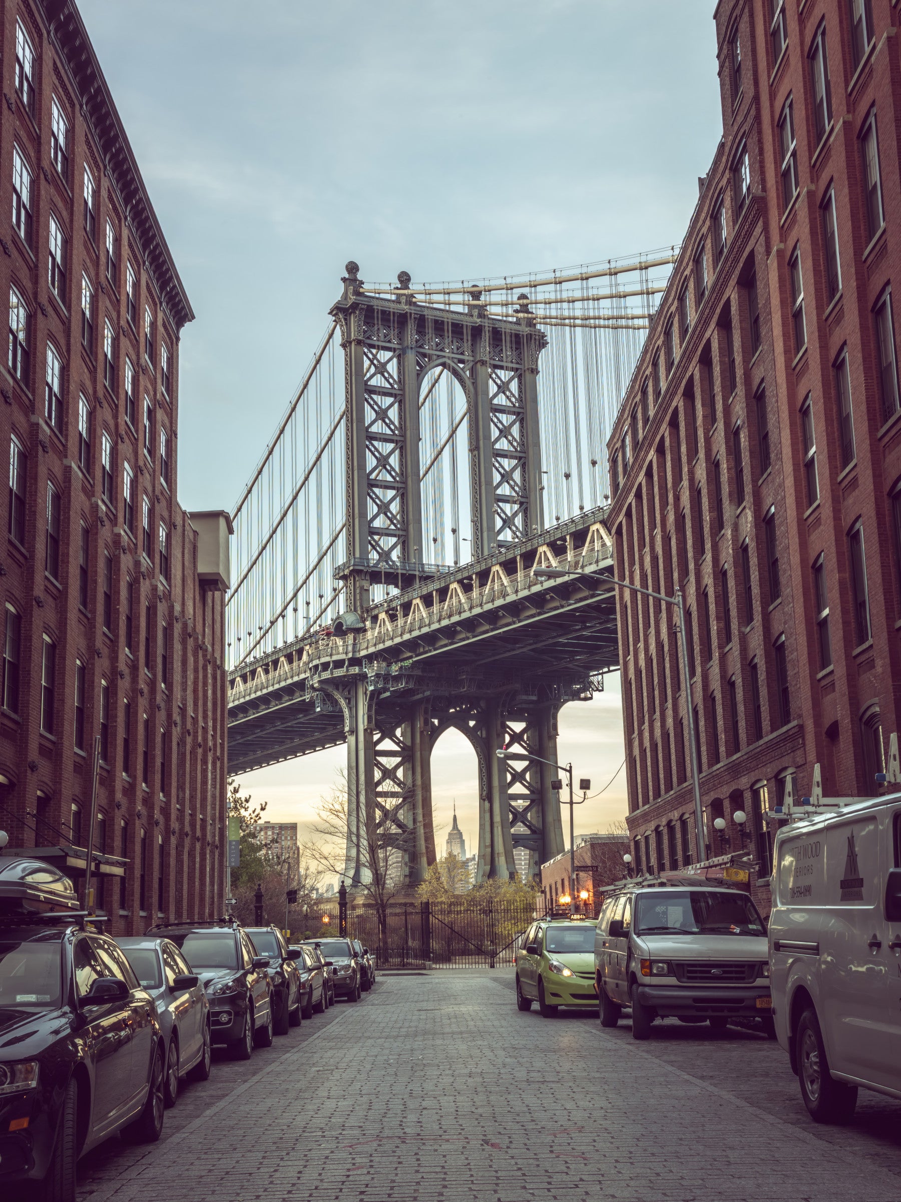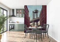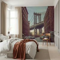 Manhattan Bridge seen from the Dumbo neighbourhood in Brooklyn, New York. Capture the iconic charm of Brooklyn with this city wallpaper. Featuring the Manhattan Bridge framed by classic brick buildings and a tranquil sky, it adds an urban edge to any space. The sepia-toned palette brings warmth and works beautifully in a living room, office, or bedroom. Use this wallpaper for walls to create a stunning feature wall. The design creates depth and character, lending a metropolitan vibe to interiors. It complements both modern and industrial decors and helps create an exciting focal point.