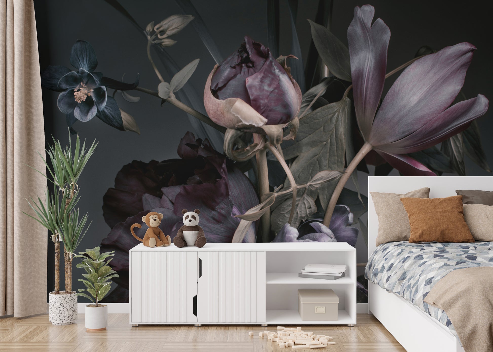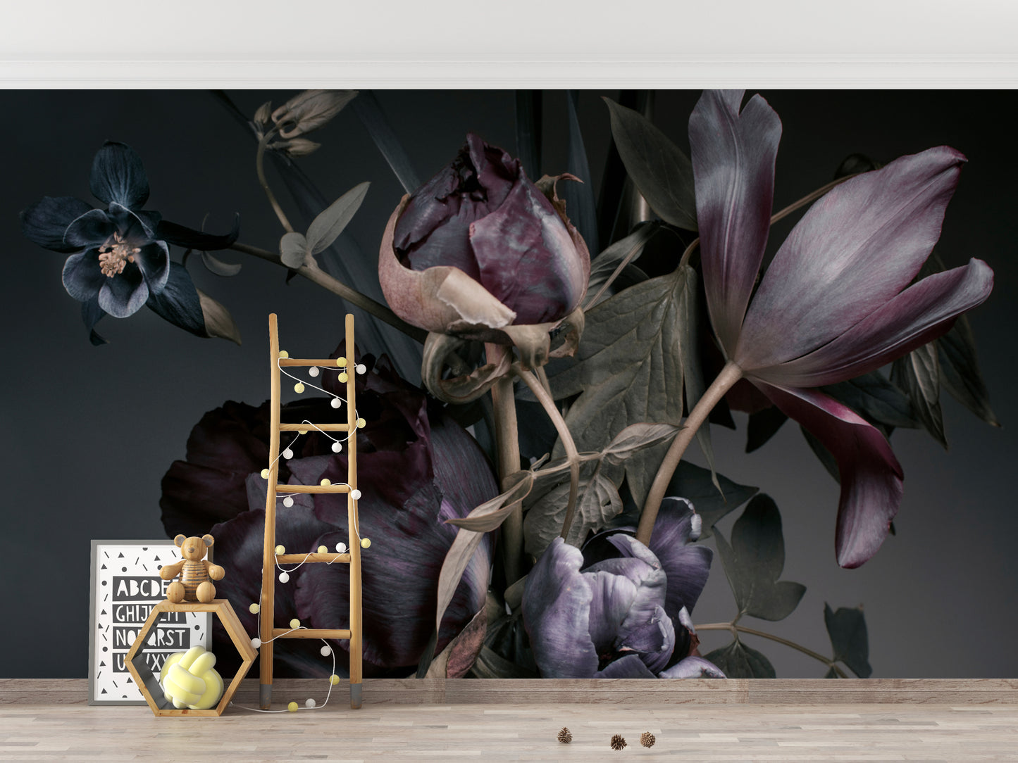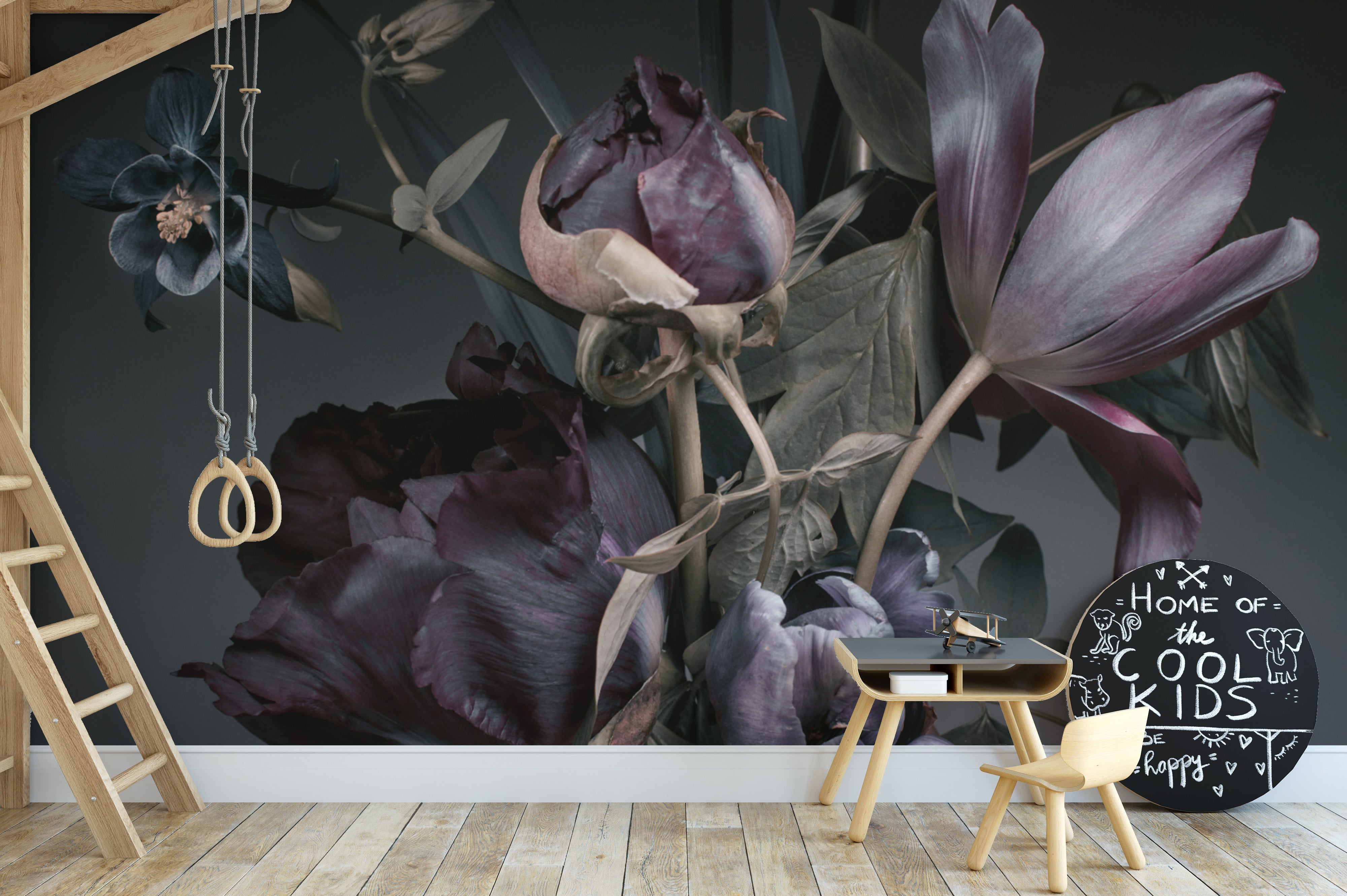 Step into a serene world every time you enter your room with our dusk flowering peonies and tulips wallpaper mural. This unique bedroom wallpaper creates a visually captivating retreat right in your home. Emanating calmness and sophistication, the design features beautiful blooms of peonies and tulips set against a twilight backdrop.