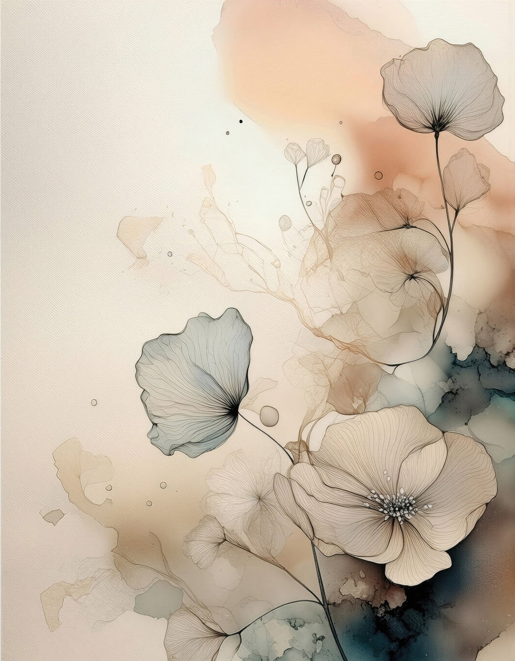Adorn your home with the elegance of delicate blooms in ink. This design features abstract flowers in soft shades of beige, peach, and teal, creating a tranquil ambiance. See how each petal is outlined with fine lines, adding to the detailed effect. This wallpaper for walls is ideal for a bedroom, living room, or dining room, bringing a touch of sophistication. The design complements interiors with minimalist or contemporary elements, offering a serene, art-inspired aesthetic.