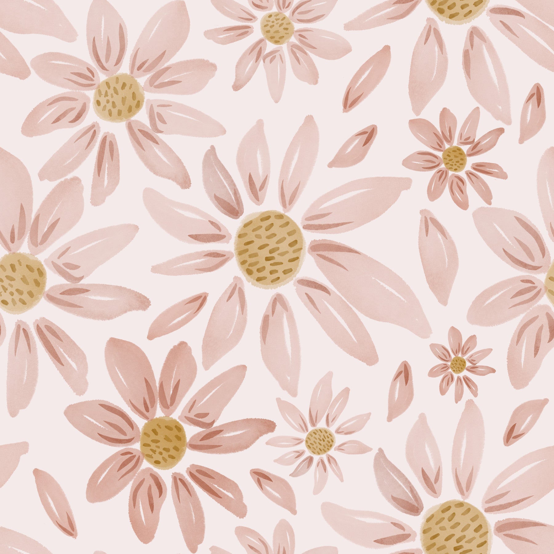 Dusty Rose Floral Dream wallpaper featuring soft pink hand-painted flowers with warm yellow centers.