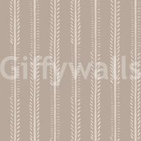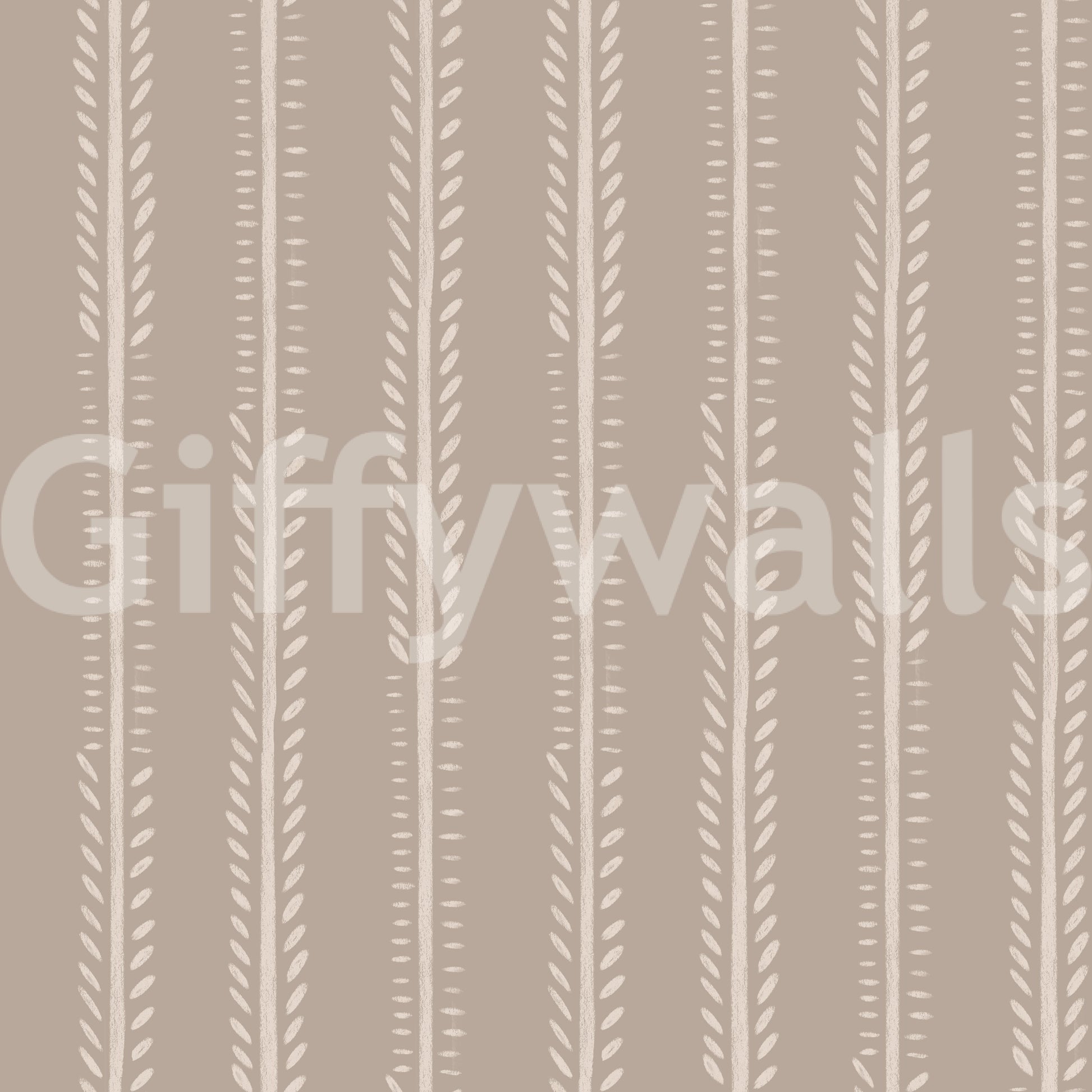 Embrace natural serenity with this wallpaper. Vertical stripes in a muted taupe are delicately accented by a repeating pattern of hand-drawn, leaf-like shapes in a creamy off-white. The subtle textural elements give the design a handcrafted feel, contributing to its calm and peaceful atmosphere. The color palette is perfectly suited to those seeking a tranquil, earthy vibe. Perfect for creating a soothing space in bedrooms, living rooms, or home offices. The timeless aesthetic seamlessly blends with diverse interior styles.
