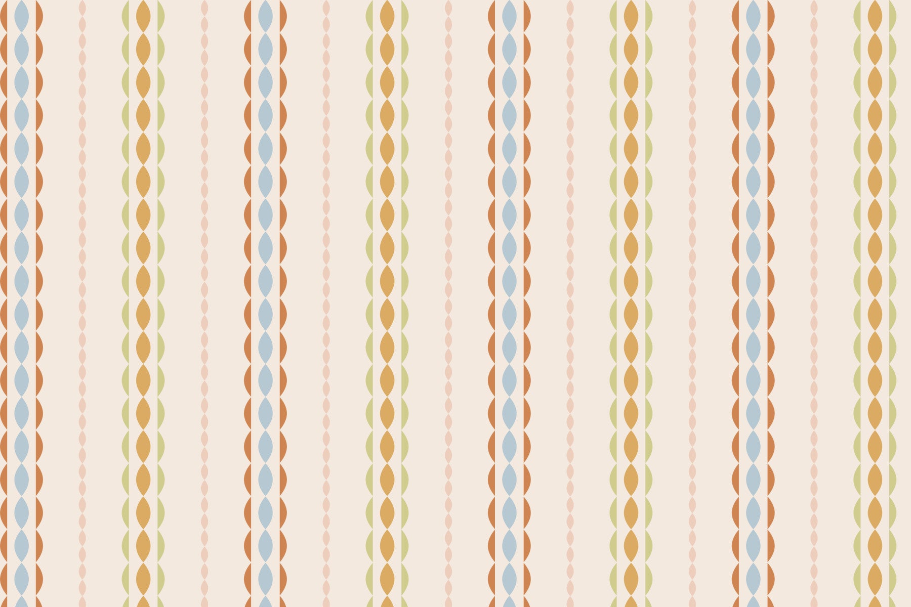 Embrace a retro-inspired atmosphere with this dynamic wallpaper for walls. The design showcases a repeated geometric pattern with stylized scalloped shapes arranged in vertical lines. Earthy colours like light blue, orange, and green dominate the palette, contrasting nicely with a pale beige backdrop. Install it in a kitchen, bedroom, or dining room to amplify the charm. This design effortlessly enhances interiors by introducing a harmonious blend of playfulness and classic style.